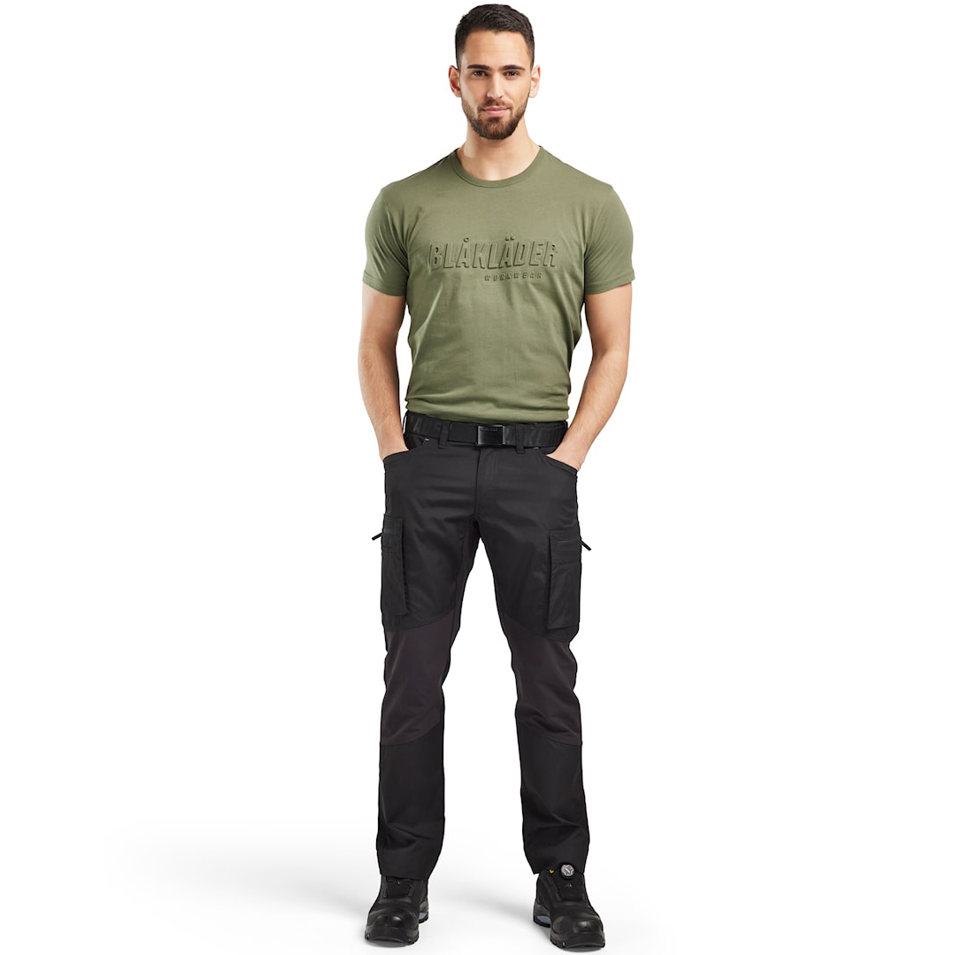 Das stilvolle Baumwoll-T-Shirt mit markantem 3D-„Blakläder“-Schriftzug auf der Brust ist die perfekte Wahl für die Arbeit und den Alltag. Der lockere Schnitt sorgt für hohen Tragekomfort und uneingeschränkte Bewegungsfreiheit. Hergestellt aus 100 % Baumwolle (Single Jersey, 150 g/m2), bietet das Shirt eine angenehme Atmungsaktivität und ein weiches Tragegefühl. Der Rundhalsausschnitt mit geripptem Kragen sowie verstärkte Schulter- und Nackennähte sorgen für zusätzliche Strapazierfähigkeit und Langlebigkeit. Der auffällige 3D-Print „Blakläder“ unterstreicht Ihren exzellenten Geschmack in Sachen Arbeitskleidung und verleiht dem Shirt eine moderne Note.