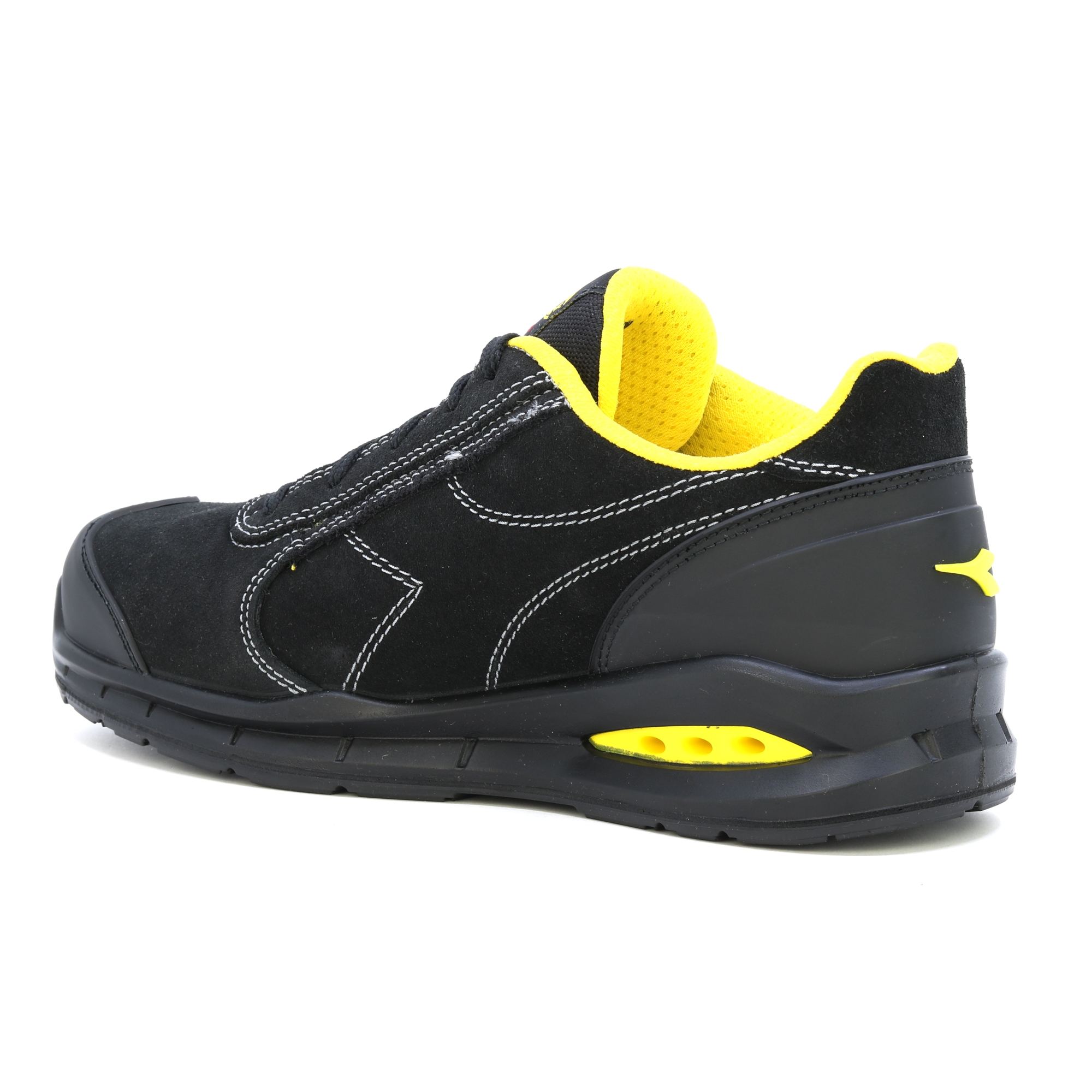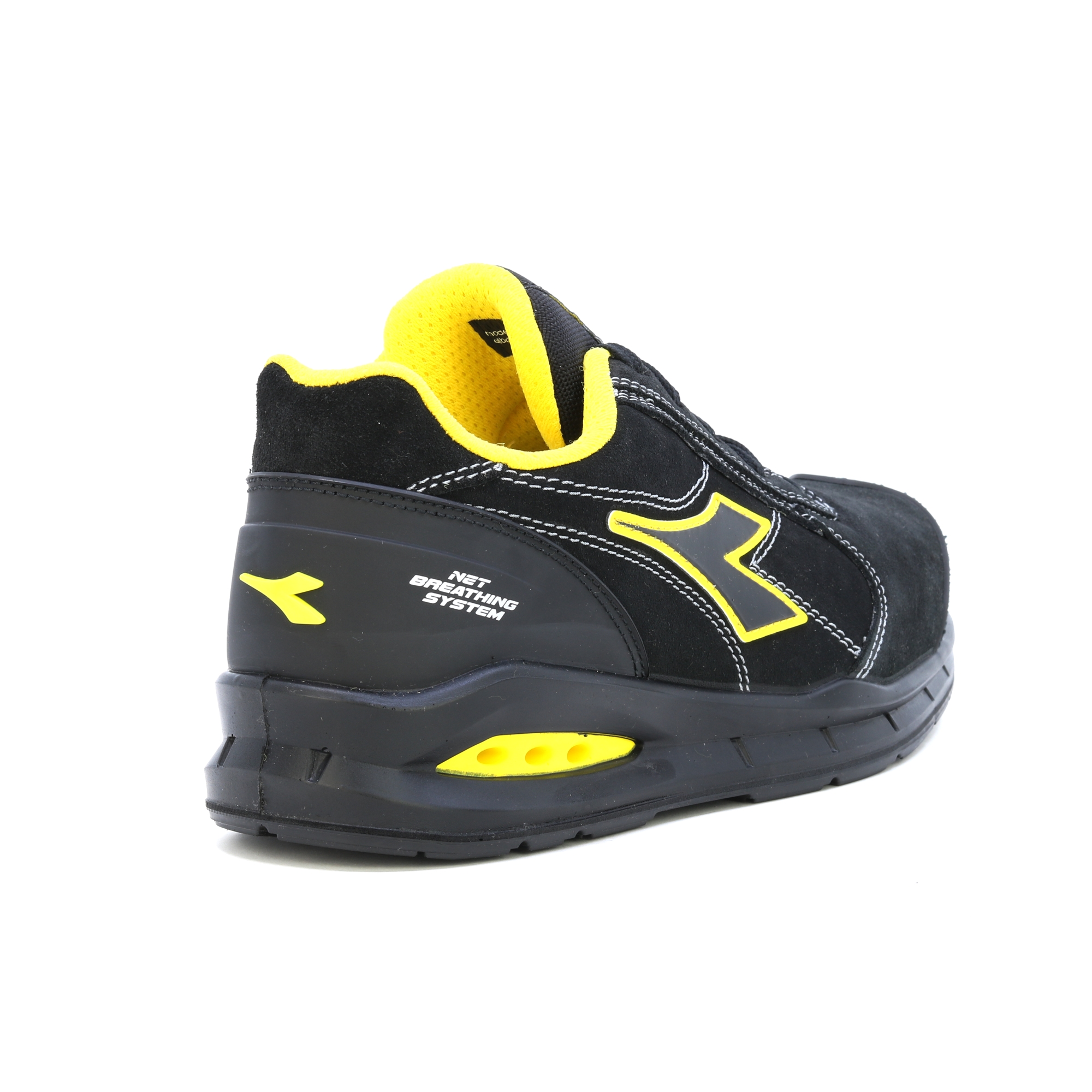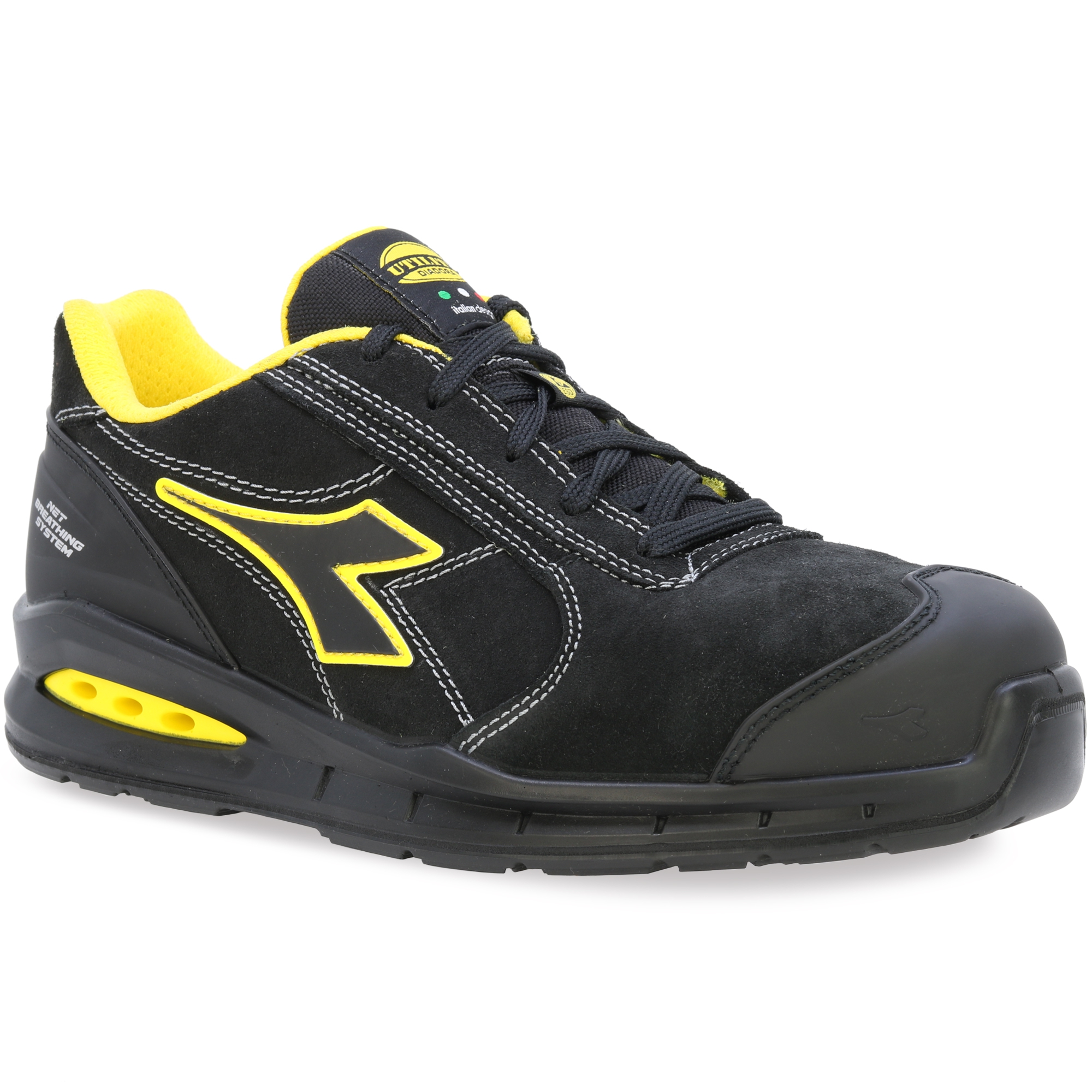 Ein Schuh der atmet! Niedriger Sicherheitsschuh S3 aus wasserabweisendem italienischem Veloursleder mit Net Breathing System von Geox an den Seiten. Aluminiumkanister 200J. Weite 11. K SOLE, abriebfestes und ultraatmungsaktives Nylonfutter und herausnehmbare atmungsaktive Einlegesohle mit Aktivkohle. ESD. ATEMSYSTEM VON GEOX - AIRBOX: Diadora Utility erweitert sein Angebot an NET ATEMSYSTEM-Produkten (lizenziert von GEOX) und führt seine eigene patentierte Technologie ein. Dieses exklusive Sortiment wurde in den Forschungslabors von Diadora entwickelt und steht für Exzellenz in Innovation und Design. Diese Schuhe lassen den Fuß frei atmen und bieten maximalen Komfort in jeder Situation. Die innovative seitliche Position der Belüftungslöcher im neuen Airbox-Design sorgt für unübertroffene Atmungsaktivität. Die spezielle GEOX Diadora-Membran wurde jetzt weiter verbessert, indem Löcher an den Seiten hinzugefügt wurden, die eine maximale Atmungsaktivität für den Fuß gewährleisten und gleichzeitig in perfekter Harmonie mit den Schutzelementen bleiben, aus denen der Schuh besteht. Untersuchungen haben bestätigt, dass diese Membran – die winzige Löcher oder „Mikroporen“ enthält, die kleiner als ein Wassertropfen, aber größer als ein Wasserdampfmolekül sind – verhindert, dass Wasser in den Schuh eindringt, während sie dafür sorgt, dass der Fuß trocken bleibt.