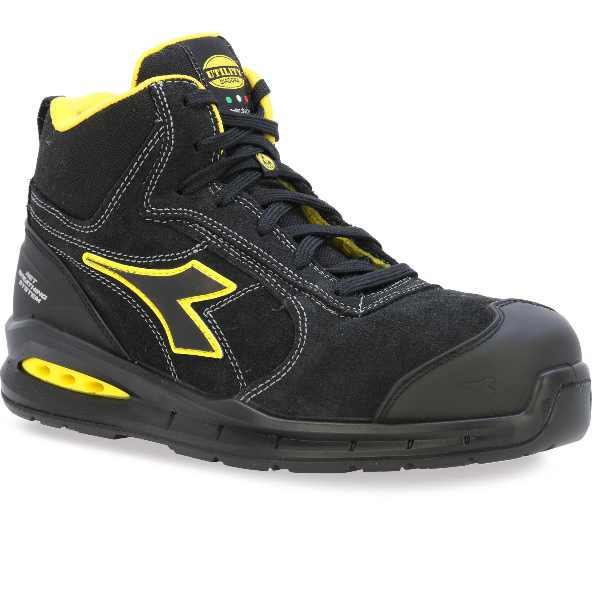 Ein Schuh der atmet! Niedriger Sicherheitsschuh S3 aus wasserabweisendem italienischem Veloursleder mit Net Breathing System von Geox an den Seiten. Aluminiumkanister 200J. Weite 11. K SOLE, abriebfestes und ultraatmungsaktives Nylonfutter und herausnehmbare atmungsaktive Einlegesohle mit Aktivkohle. ESD. ATEMSYSTEM VON GEOX - AIRBOX: Diadora Utility erweitert sein Angebot an NET ATEMSYSTEM-Produkten (lizenziert von GEOX) und führt seine eigene patentierte Technologie ein. Dieses exklusive Sortiment wurde in den Forschungslabors von Diadora entwickelt und steht für Exzellenz in Innovation und Design. Diese Schuhe lassen den Fuß frei atmen und bieten maximalen Komfort in jeder Situation. Die innovative seitliche Position der Belüftungslöcher im neuen Airbox-Design sorgt für unübertroffene Atmungsaktivität. Die spezielle GEOX Diadora-Membran wurde jetzt weiter verbessert, indem Löcher an den Seiten hinzugefügt wurden, die eine maximale Atmungsaktivität für den Fuß gewährleisten und gleichzeitig in perfekter Harmonie mit den Schutzelementen bleiben, aus denen der Schuh besteht. Untersuchungen haben bestätigt, dass diese Membran – die winzige Löcher oder „Mikroporen“ enthält, die kleiner als ein Wassertropfen, aber größer als ein Wasserdampfmolekül sind – verhindert, dass Wasser in den Schuh eindringt, während sie dafür sorgt, dass der Fuß trocken bleibt.