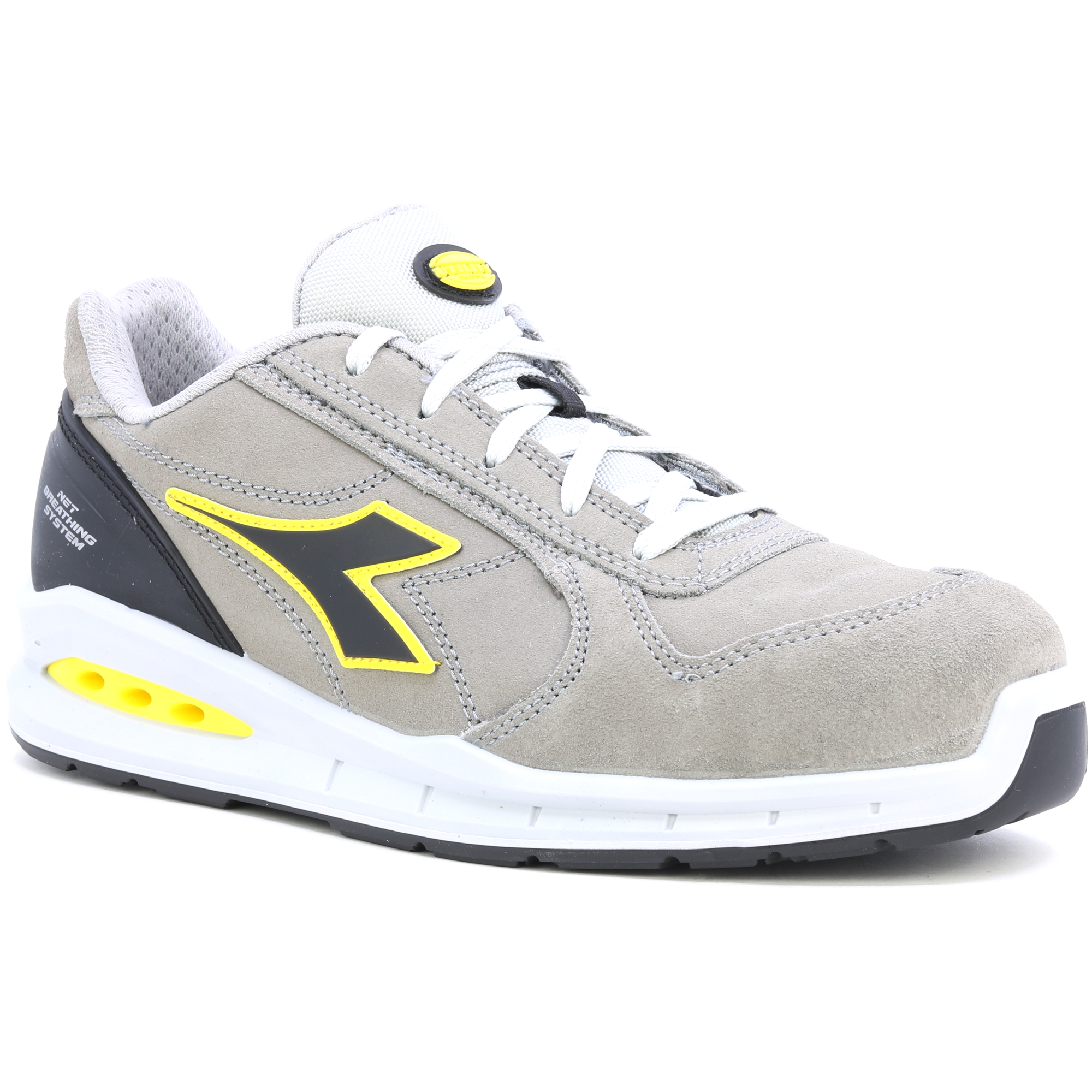 Arbeitsstiefel, die atmen! Niedrige Sicherheitsschuhe S3 aus Wildleder, wasserabweisend und atmungsaktiv mit dem Net Breathing System von Geox an den Seiten. K SOLE, eine abriebfeste und ultradurchlässige Nylonfütterung, eine herausnehmbare und atmungsaktive Einlegesohle mit Aktivkohle. Das Geox-System fördert den Luftstrom von den Schuhen nach außen und verhindert das Schwitzen der Füße. ATMUNGSSYSTEM VON GEOX - AIRBOX: Diadora Utility erweitert ihre Produktreihe NET BREATHING SYSTEM (lizenziert von Geox) und führt ihre eigene patentierte Technologie ein. Diese exklusive Reihe, entwickelt in den Forschungslaboren von Diadora, bietet Perfektion in Bezug auf Innovation und Design. Diese Schuhe lassen den Fuß frei atmen und bieten maximalen Komfort in jeder Situation. Die innovative seitliche Positionierung der Belüftungsöffnungen in der neuen Airbox-Konstruktion sorgt für unübertroffene Atmungsaktivität. Die spezielle Geox-Diadora-Membran wurde nun durch die Hinzufügung von seitlichen Öffnungen weiter verbessert, die eine maximale Atmungsaktivität für den Fuß gewährleisten und gleichzeitig in perfekter Harmonie mit den Schutzelementen des Schuhs bleiben. Untersuchungen haben gezeigt, dass diese Membran - die winzige Löcher oder "Mikroporen" enthält, die kleiner als ein Wassertropfen, aber größer als ein Wasserdampfmolekül sind - das Eindringen von Wasser in den Schuh verhindert und gleichzeitig sicherstellt, dass der Fuß trocken bleibt.
