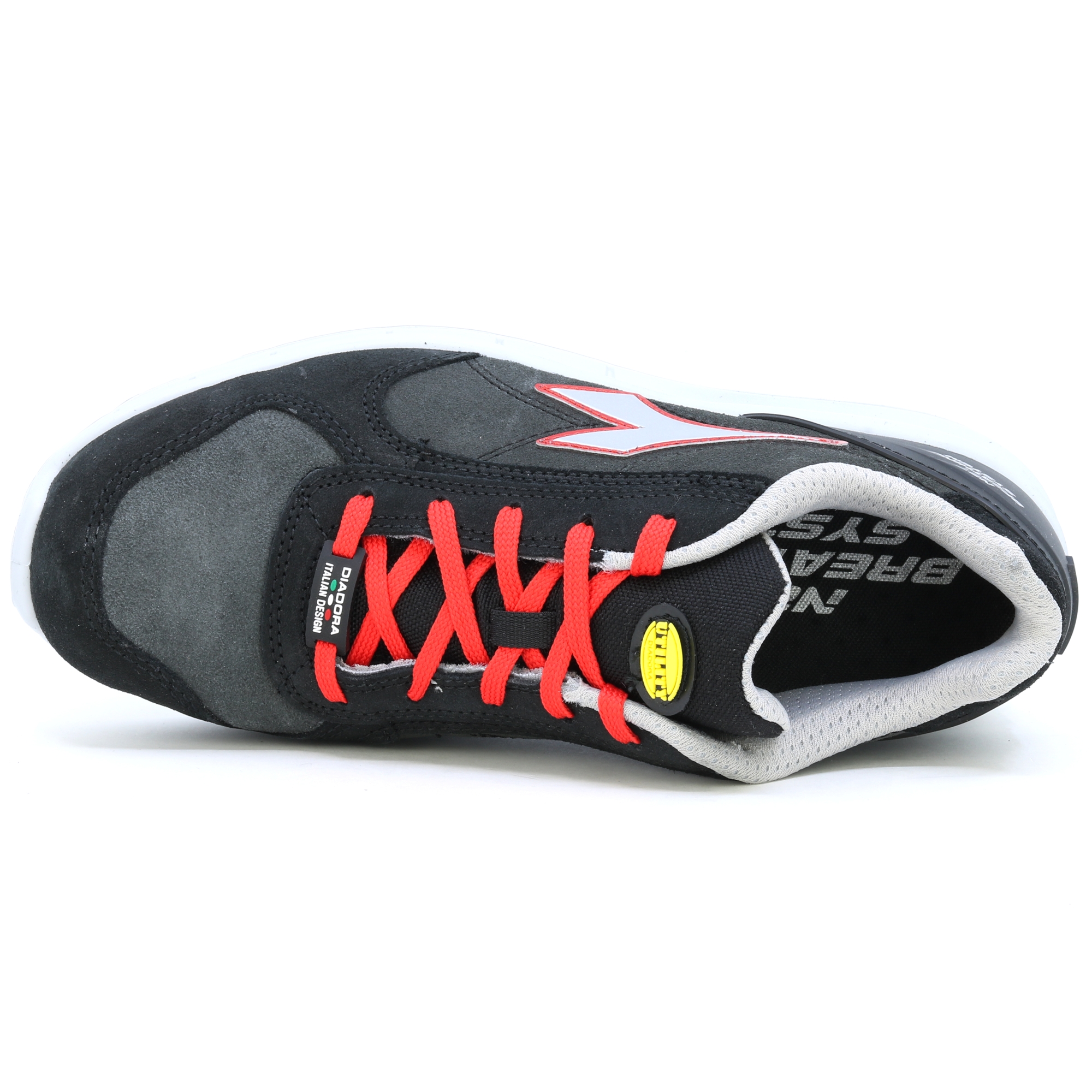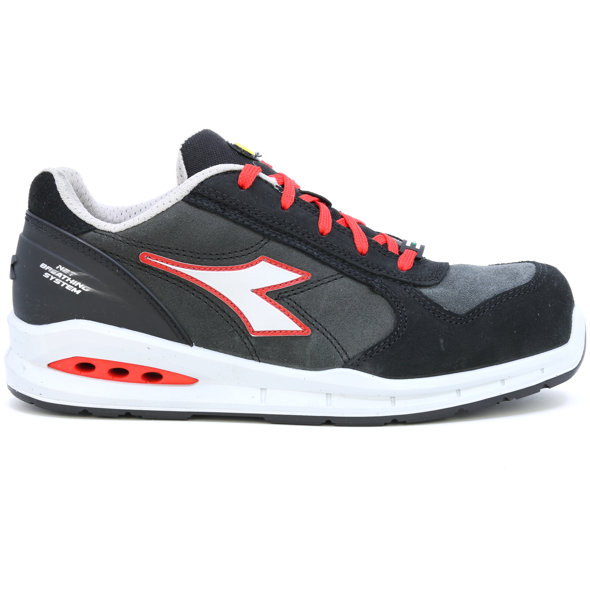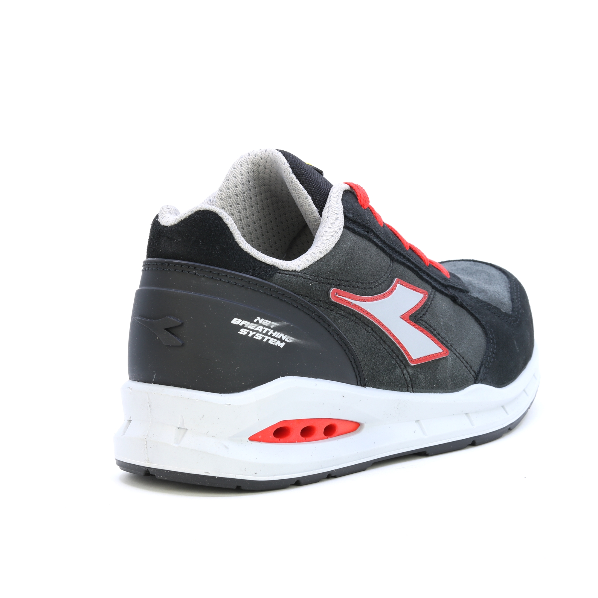 Ein Arbeitsschuh der atmet! Niedriger Sicherheitsschuh S3 aus Veloursleder, wasserabweisend und atmungsaktiv mit Net Breathing System von Geox an den Seiten. K SOLE, abriebfestes und ultraatmungsaktives Nylonfutter, herausnehmbare und atmungsaktive Einlegesohle mit Aktivkohle. Das Geox-System unterstützt den Luftstrom vom Schuh nach außen und verhindert das Schwitzen des Fußes. ATEMSYSTEM VON GEOX - AIRBOX: Diadora Utility erweitert sein Angebot an NET ATEMSYSTEM-Produkten (lizenziert von GEOX) und führt seine eigene patentierte Technologie ein. Dieses exklusive Sortiment wurde in den Forschungslabors von Diadora entwickelt und steht für Exzellenz in Innovation und Design. Diese Schuhe lassen den Fuß frei atmen und bieten maximalen Komfort in jeder Situation. Die innovative seitliche Position der Belüftungslöcher im neuen Airbox-Design sorgt für unübertroffene Atmungsaktivität. Die spezielle GEOX Diadora-Membran wurde jetzt weiter verbessert, indem Löcher an den Seiten hinzugefügt wurden, die eine maximale Atmungsaktivität für den Fuß gewährleisten und gleichzeitig in perfekter Harmonie mit den Schutzelementen bleiben, aus denen der Schuh besteht. Untersuchungen haben bestätigt, dass diese Membran – die winzige Löcher oder „Mikroporen“ enthält, die kleiner als ein Wassertropfen, aber größer als ein Wasserdampfmolekül sind – verhindert, dass Wasser in den Schuh eindringt, während sie dafür sorgt, dass der Fuß trocken bleibt