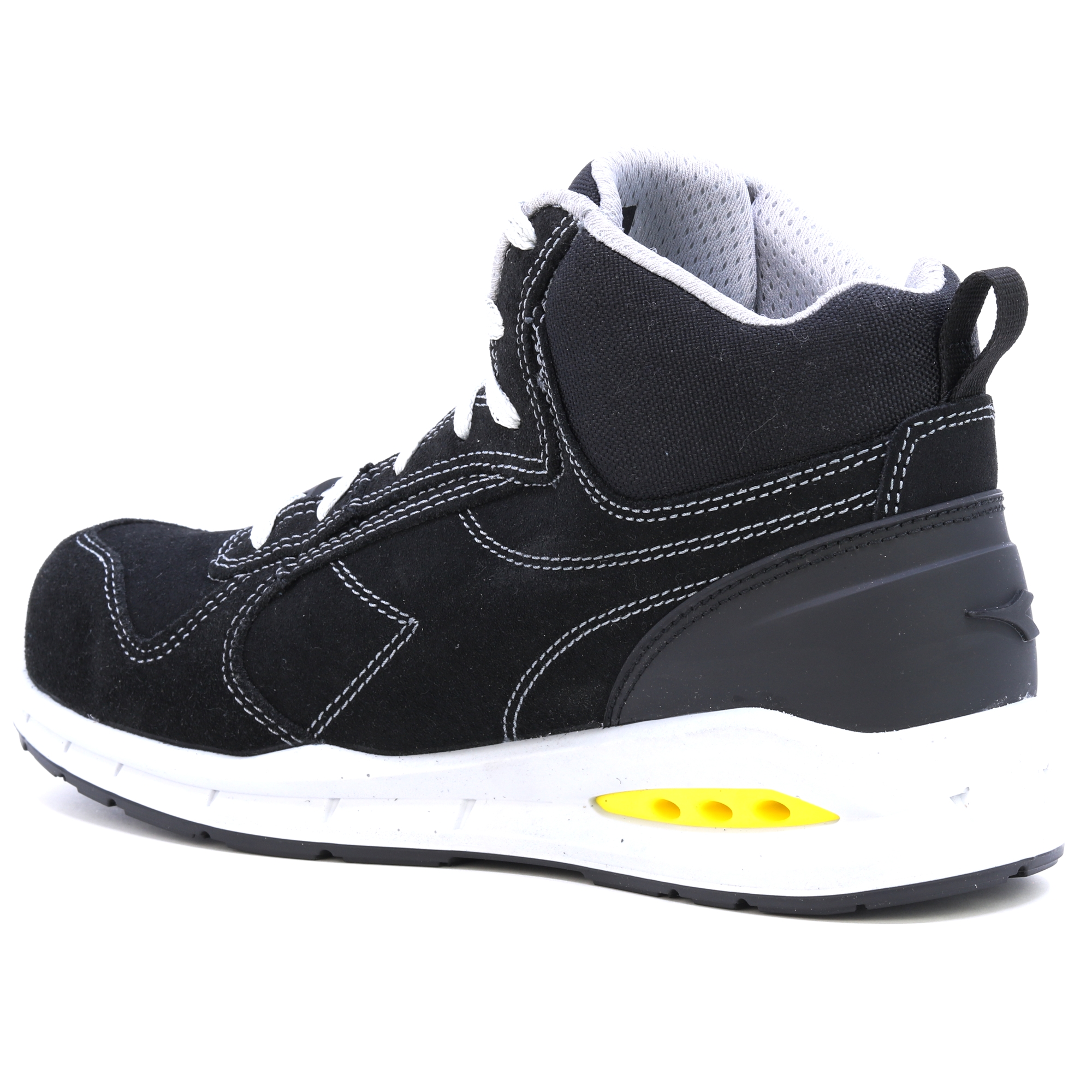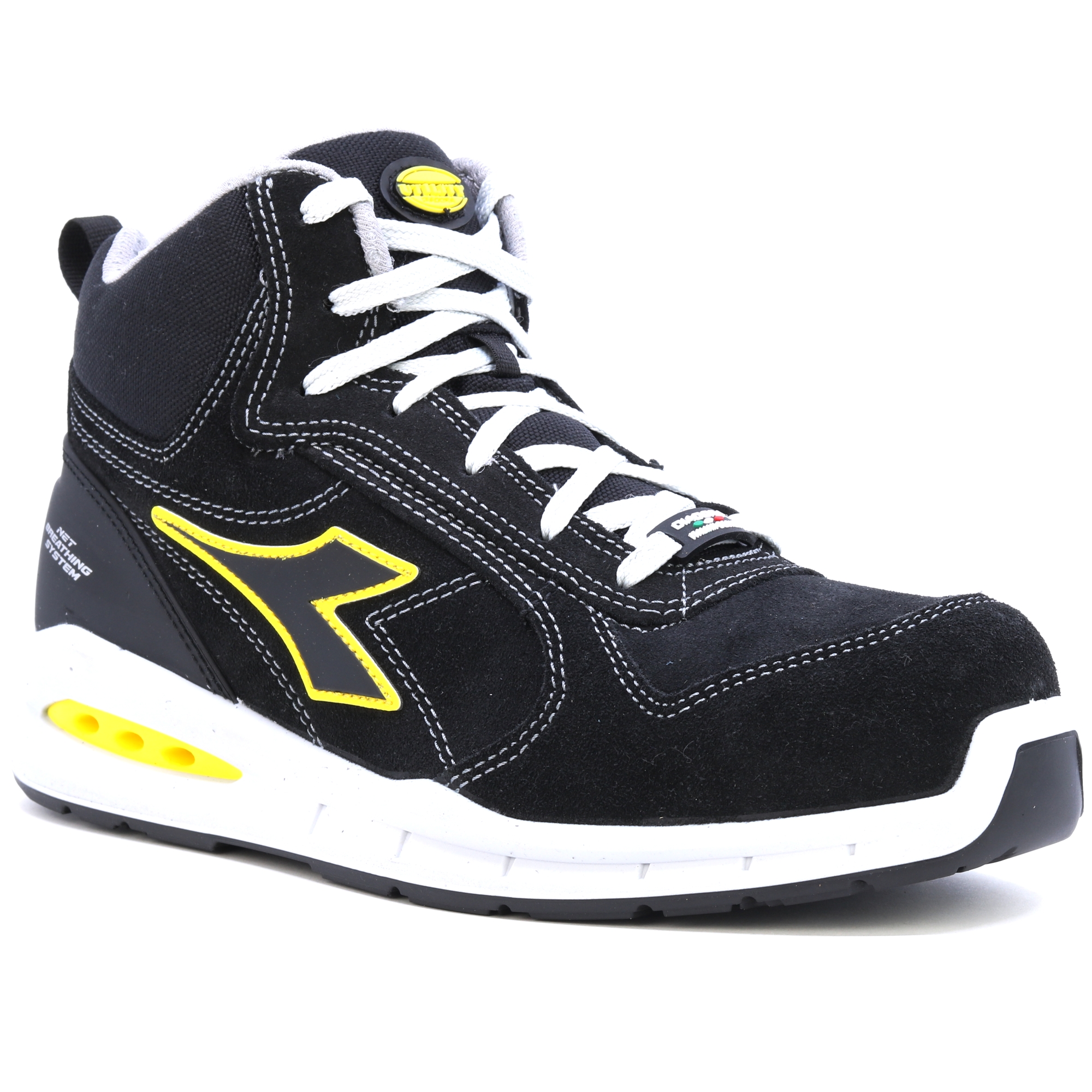 Knöchel-Sicherheitsschuhe S3 aus Veloursleder, wasserabweisend und atmungsaktiv mit Net Breathing System von Geox an den Seiten. K SOLE, Nylon abriebfestes und ultra atmungsaktives Futter, herausnehmbare und atmungsaktive Einlegesohle mit Aktivkohle.