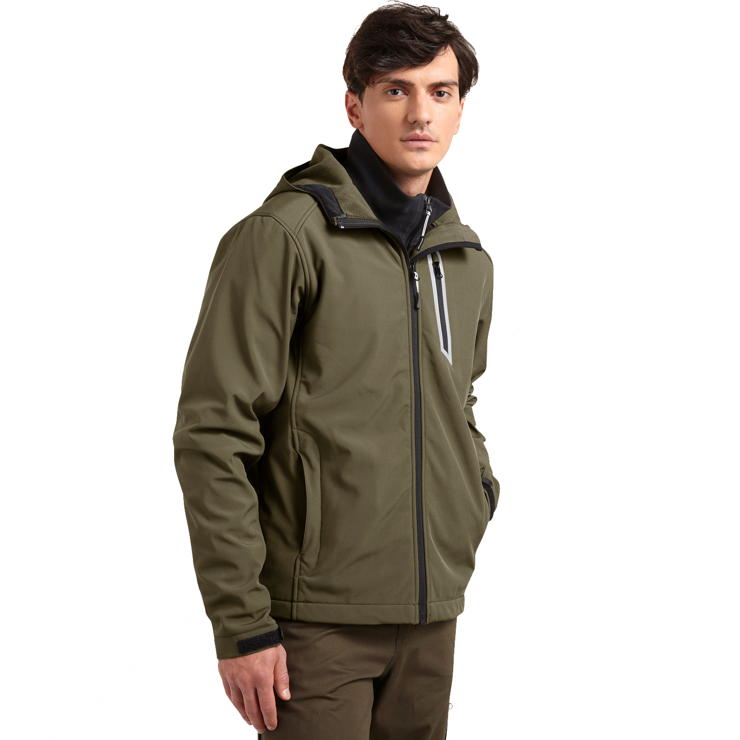 Softshelljacke, 3 Fronttaschen mit Reißverschluss und eine Brusttasche, reflektierende Details, verstellbare Kapuze. Verstellbare Manschetten. Wassersäule: 3000 mm. Windwiderstand: 3000 mvp Softshell 94 % Polyester – 6 % Elastan 300 g/m