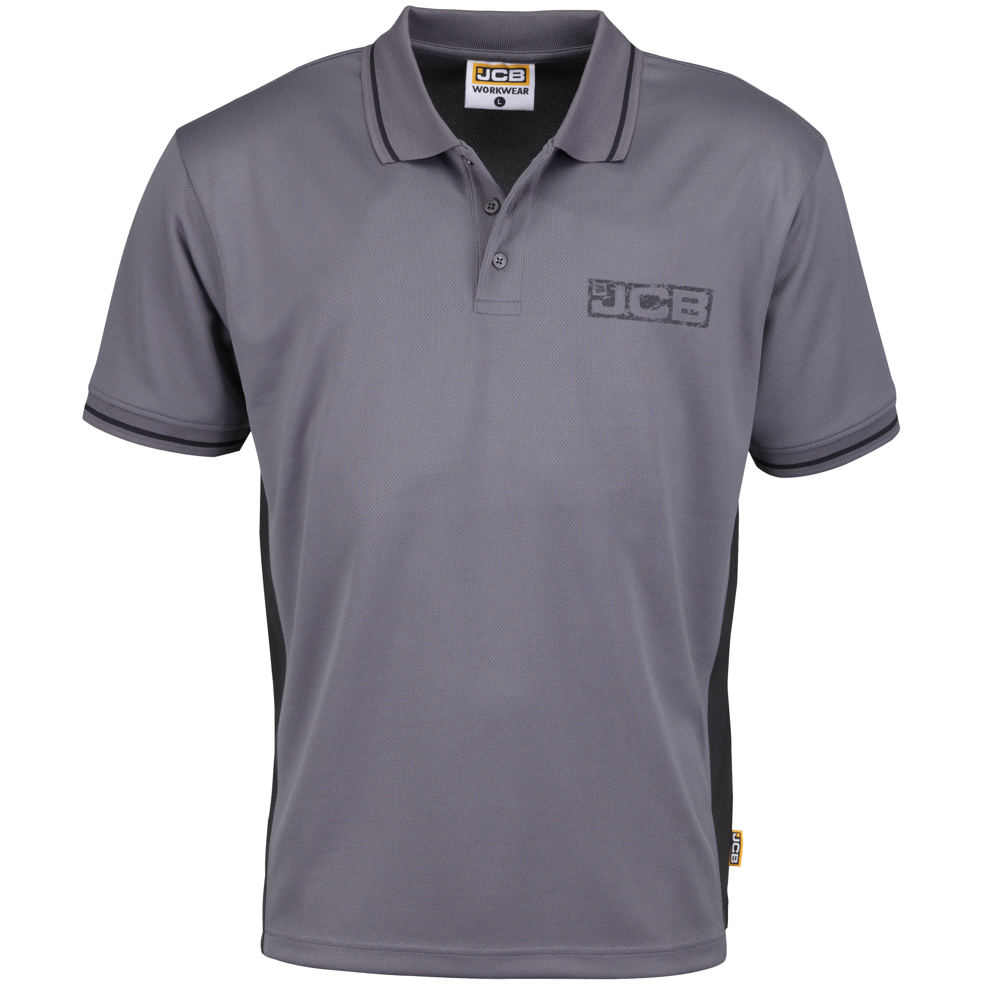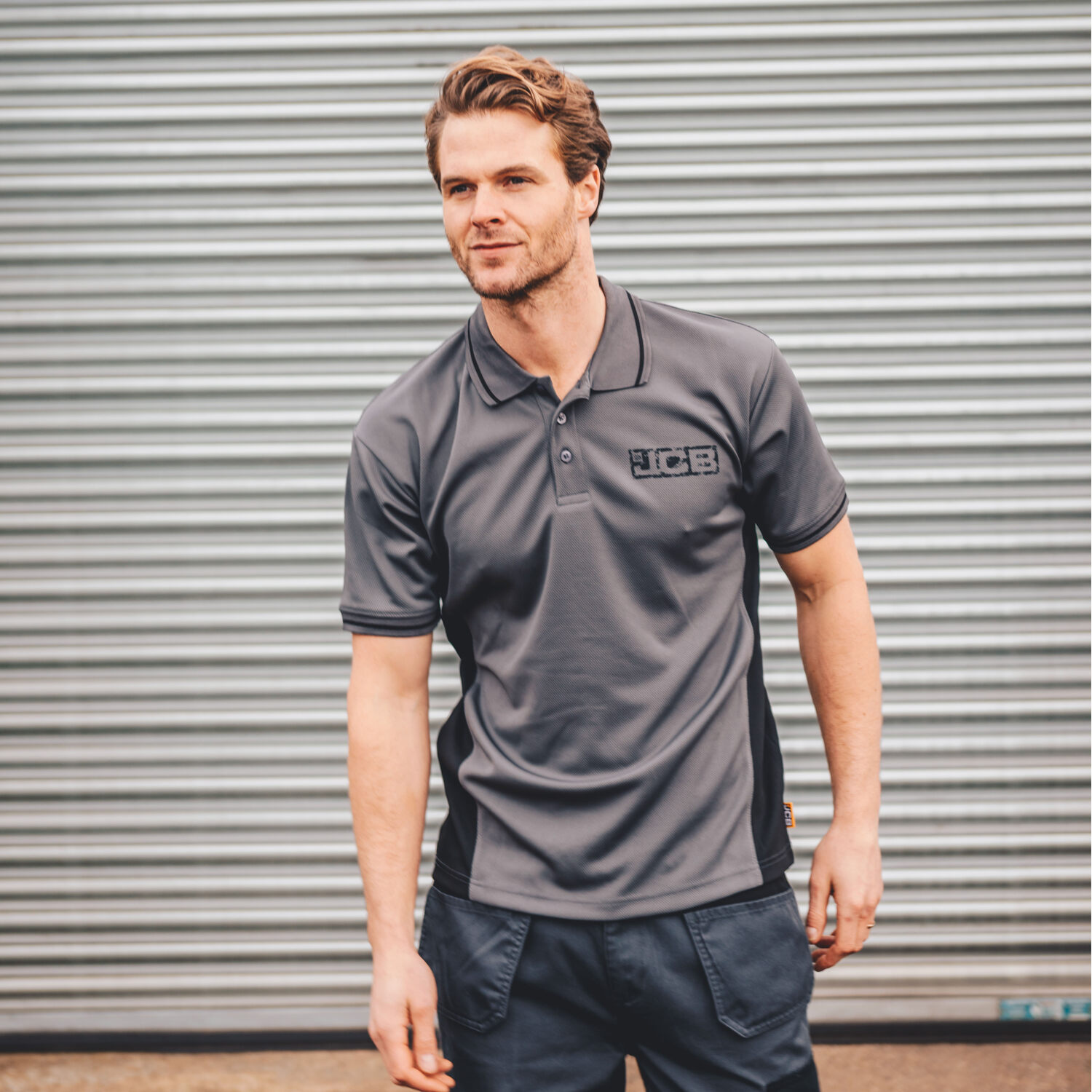 Schnell trocknendes Poloshirt 100 % Polyester, 175 g/m2. Feuchtigkeitsableitendes Gewebe mit antibakterieller Behandlung. Schwarze und graue Kontraststile. Drei Knöpfe vorne. Flachgestrickter Kragen und Ärmelbündchen. JCB-Logo auf der linken Brust. Gewebtes JCB-Logo am linken Saum.