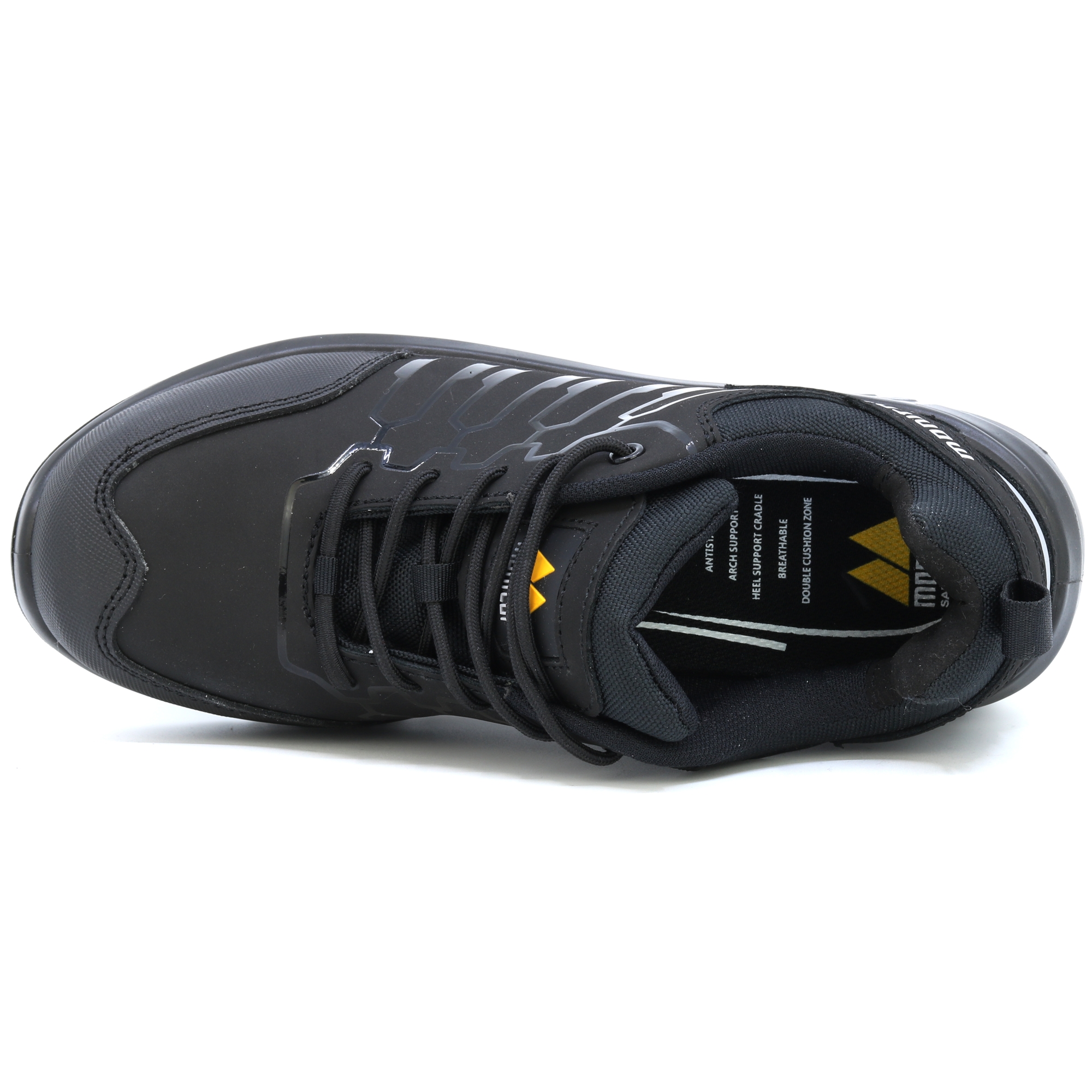 Micro hat die herkömmliche Schnürung mit Staublasche. Innenmaterial aus feuchtigkeitsabsorbierendem Textil. Die Zehenkappe besteht aus Komposit, der Durchtrittschutz aus weichem APT.