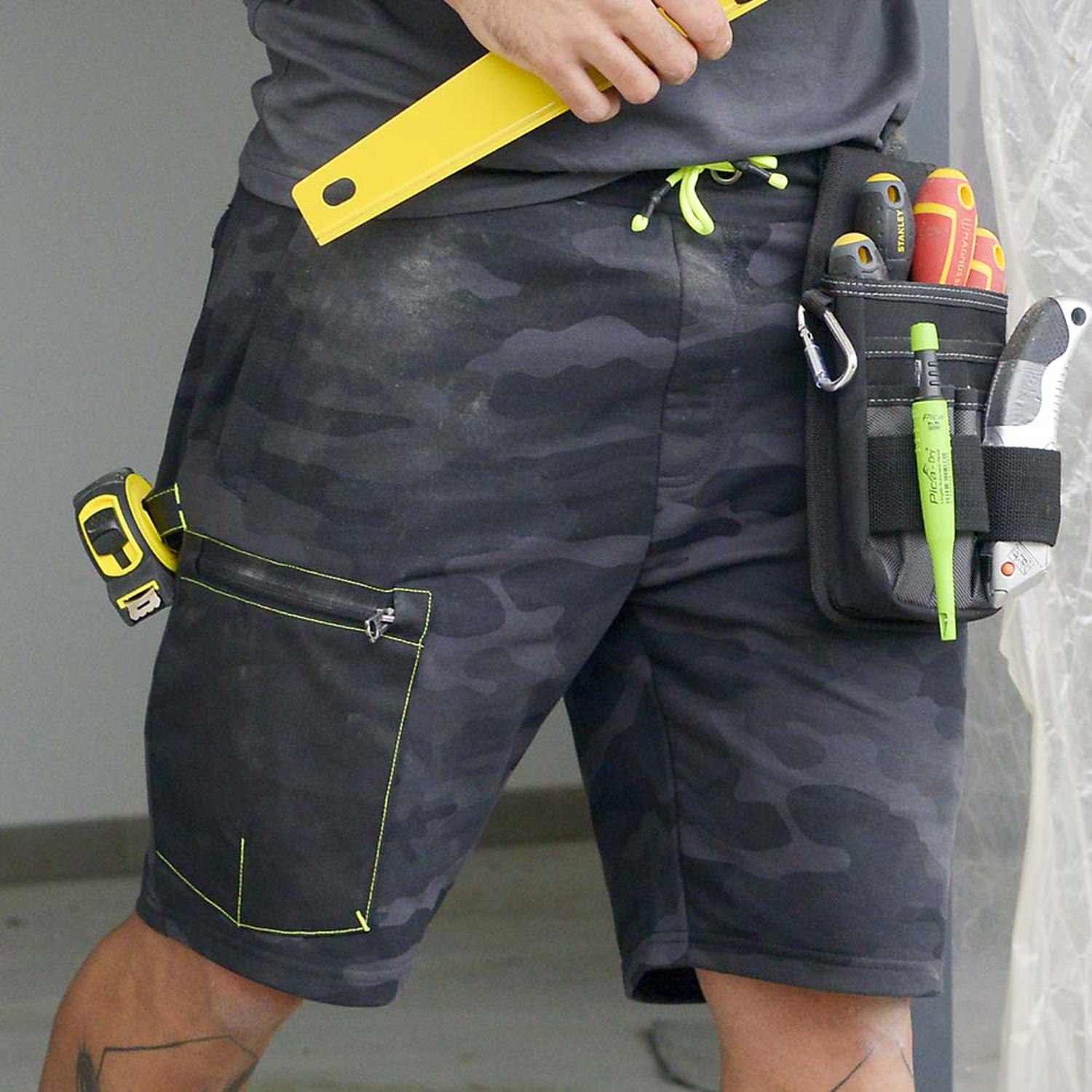 FRENCH TERRY, 65 % Polyester, 35 % Baumwolle, 250 g/m2, 600D Oxford-Verstärkung mit 100 % Polyester-PU-Beschichtung, 250 g/m2. SPEZIFIKATIONEN: Verstärkung der Taschen. Gummiband. Kordelzug. 5 Taschen: 3 Reißverschlusstaschen, 2 aufgenähte Taschen, 1 Gurtbandschlaufe, 1 Werkzeughalterschlaufe