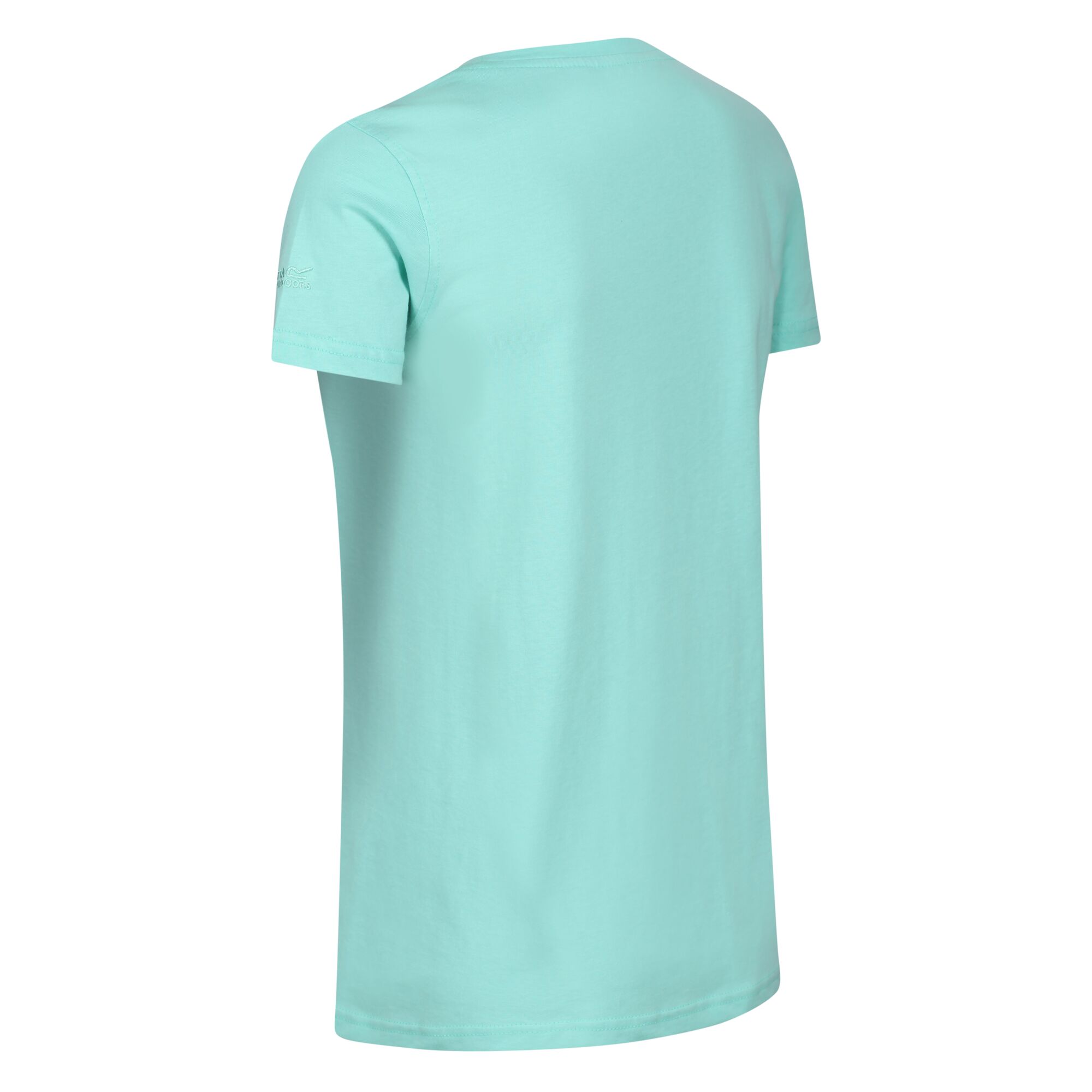 Damen-T-Shirt mit kurzen Ärmeln Regatta Filandra III. Coolweave-Technologie mit Kühleffekt. Baumwollfasern haben einen ganz natürlichen Kühleffekt direkt auf der Haut. Auf der Vorderseite drucken. Material: 100 % Baumwolle.