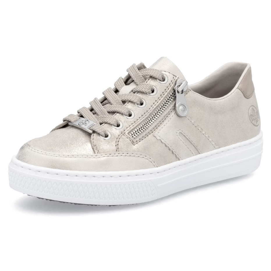 Die strahlenden RIEKER-Sneaker in goldener Farbnuance beeindrucken mit ihrem modernen Look und stilvollen dekorativen Elementen. Der praktische Reißverschluss am Spann erleichtert das Anziehen, während die Schnürung eine perfekte Anpassung an die Fußform ermöglicht. Die weiche MemoSoft-Einlegesohle mit Memory-Schaum bietet höchsten Komfort und absorbiert Stöße bei jedem Schritt, was besonders bei langen Tagen geschätzt wird. Die höhere Sohle verbessert nicht nur die Stabilität, sondern verleiht dem Schuh auch einen modischen Touch. Diese Sneaker sind die ideale Wahl für den Alltag – sei es in der Stadt, in der Freizeit oder bei leichter sportlicher Aktivität. Dank der Antistress- und MemoSoft-Technologien vereinen sie Stil mit maximalem Komfort.