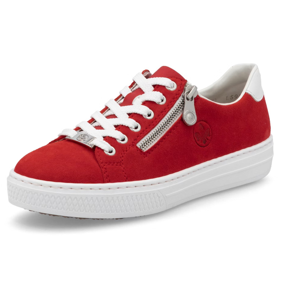 Die handgenähten Ledersneaker von Rieker in kräftigem Rot mit einem weißen Akzent an der Ferse sind die perfekte Wahl für Frauen, die stilvolle und bequeme Schuhe suchen. Die klassische weiße Schnürung wird durch einen praktischen Reißverschluss ergänzt, der das Anziehen erleichtert. Die hochwertige, handgenähte Konstruktion aus natürlichem Leder sorgt für Strapazierfähigkeit, optimale Atmungsaktivität und eine natürliche Anpassung an den Fuß. Der weiche MemoSoft-Schaumeinsatz dämpft den Auftritt und die flexible Sohle absorbiert Stöße für maximalen Komfort. Dank der Antistress-Technologie, die Leichtigkeit, Flexibilität und Dämpfung bietet, sind diese Sneakers ideal für den Alltag – egal, ob in der Stadt oder bei längeren Spaziergängen.