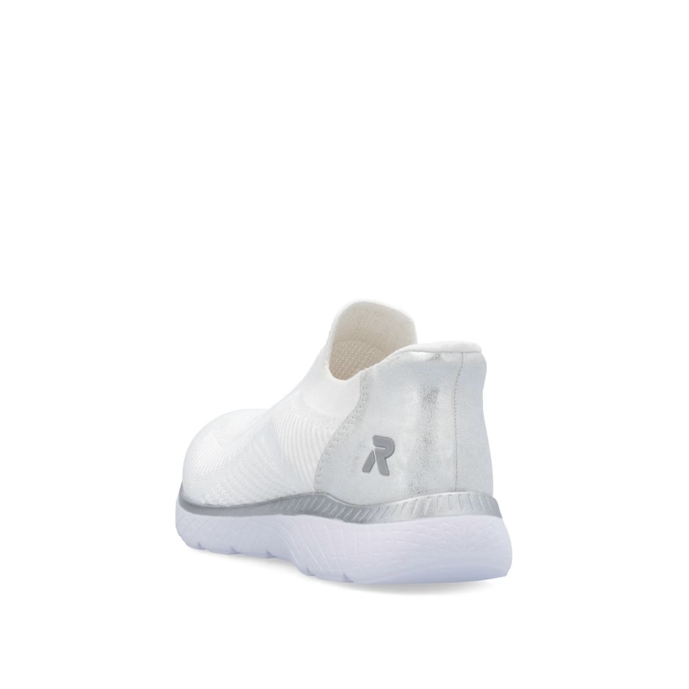 Die RIEKER Sneakers, die Sie mühelos anziehen und mit Leichtigkeit in den Tag starten, bieten nicht nur hohen Tragekomfort, sondern auch einen eleganten Stil dank der Kombination aus Weiß und Silber, die jedes Outfit aufhellt. Das textile Obermaterial sorgt für eine einfache Anpassung an die Fußform und ermöglicht ein schnelles Anziehen. Die weiche Memory-Foam-Einlegesohle passt sich perfekt an den Fuß an und bietet maximalen Komfort bei jedem Schritt. Die stoßdämpfende Sohle ist mit einem glänzenden Streifen verziert, der den Sneakern einen modernen Look verleiht und ihr einzigartiges Design unterstreicht. Eine ideale Wahl für den Alltag – sowohl für die Arbeit als auch für die Freizeit, wo modisches Design auf höchsten Tragekomfort trifft.