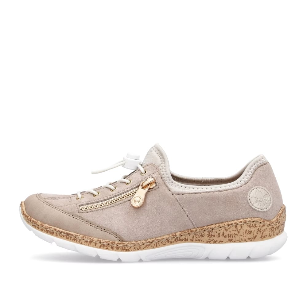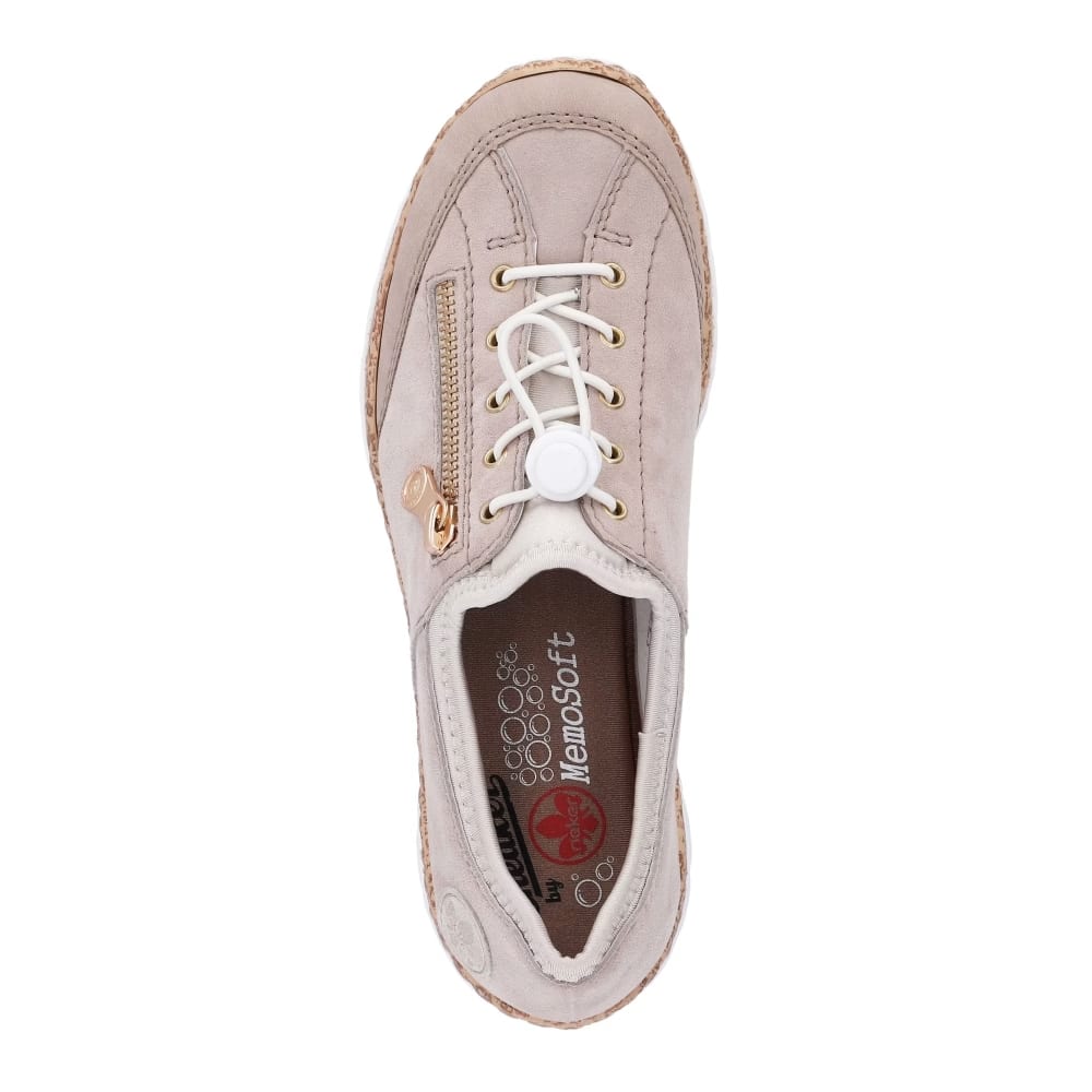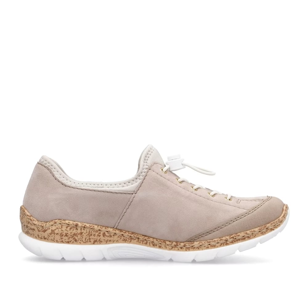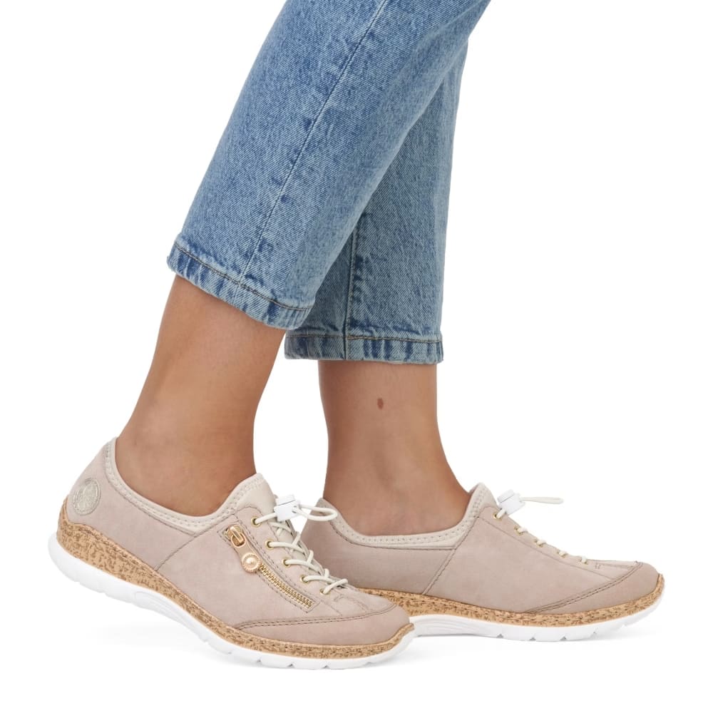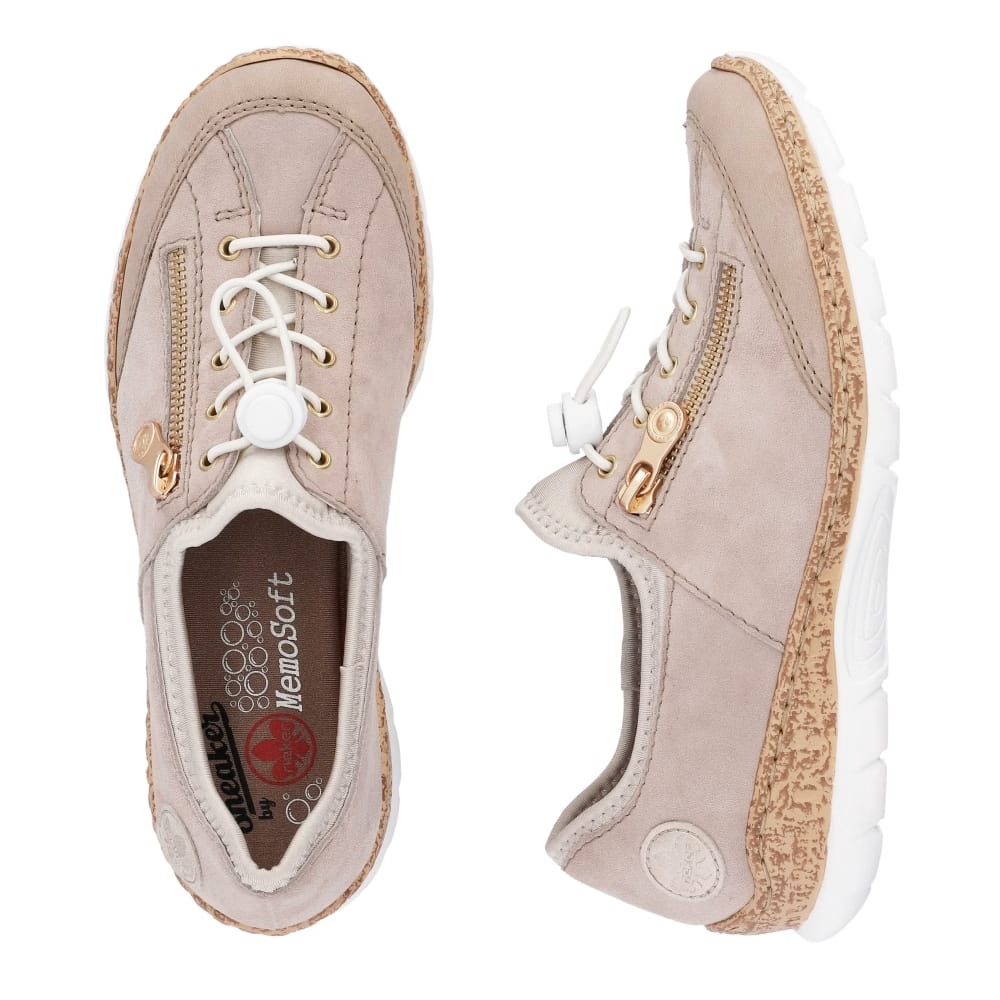 Diese Damen-Sneaker von RIEKER sind dank des natürlichen Wildledermaterials außergewöhnlich. Ergänzt wird das elegante Design durch das Markenlogo, den dekorativen Reißverschluss und die gefütterte Sohle aus Korkimitat, die sofort ins Auge fällt. Für einfaches Anziehen sorgt die Schnürung mit flexiblen Gummibändern, die bei Bedarf sanft festgezogen werden können. Wenn Sie auf der Suche nach stilvollen und bequemen Schuhen sind, ist dieses Modell die richtige Wahl für Sie. Technologie: Antistress: Eine leichte und flexible Sohle, die Stöße absorbiert und sich für maximalen Komfort an die Fußform anpasst. MemoSoft: Memory-Schaum-Einlegesohle, die den Fuß weich macht und sich der Fußform anpasst.