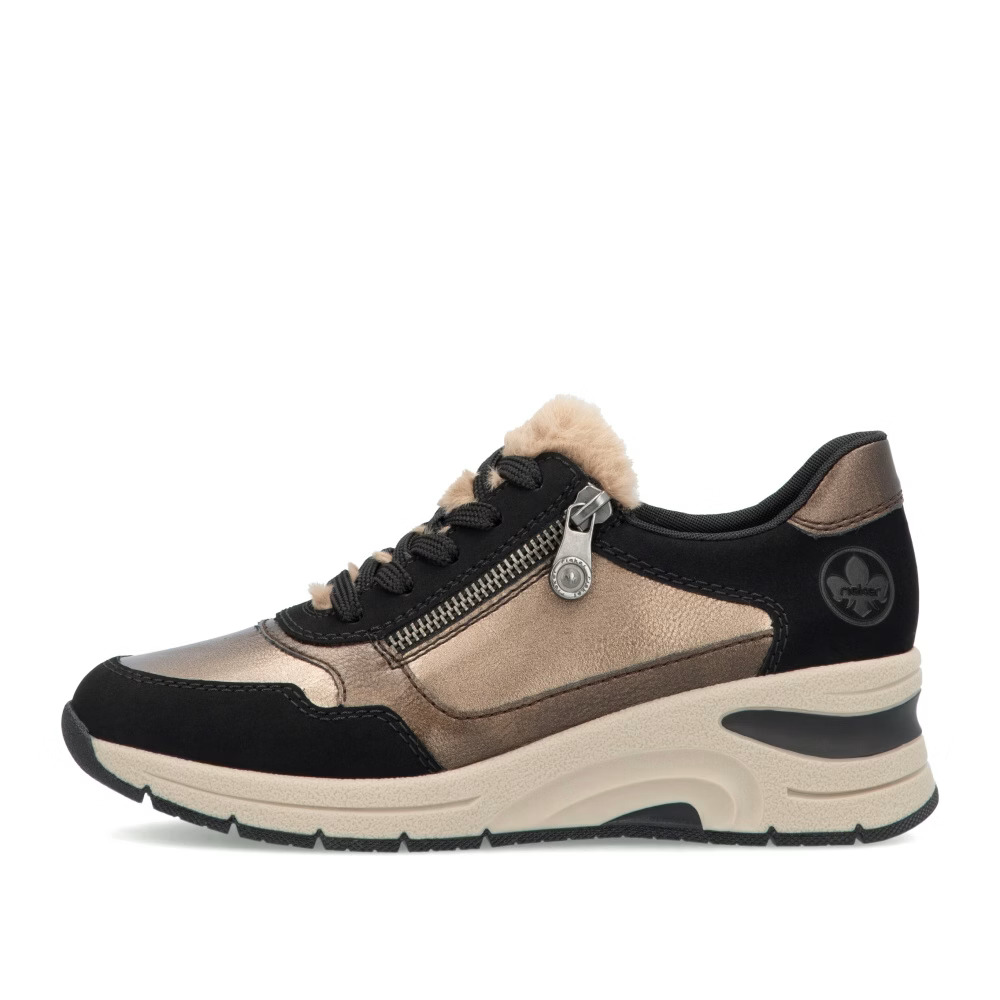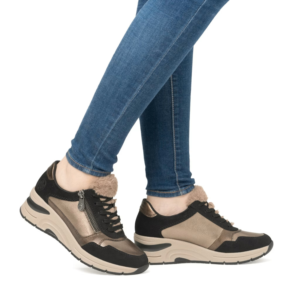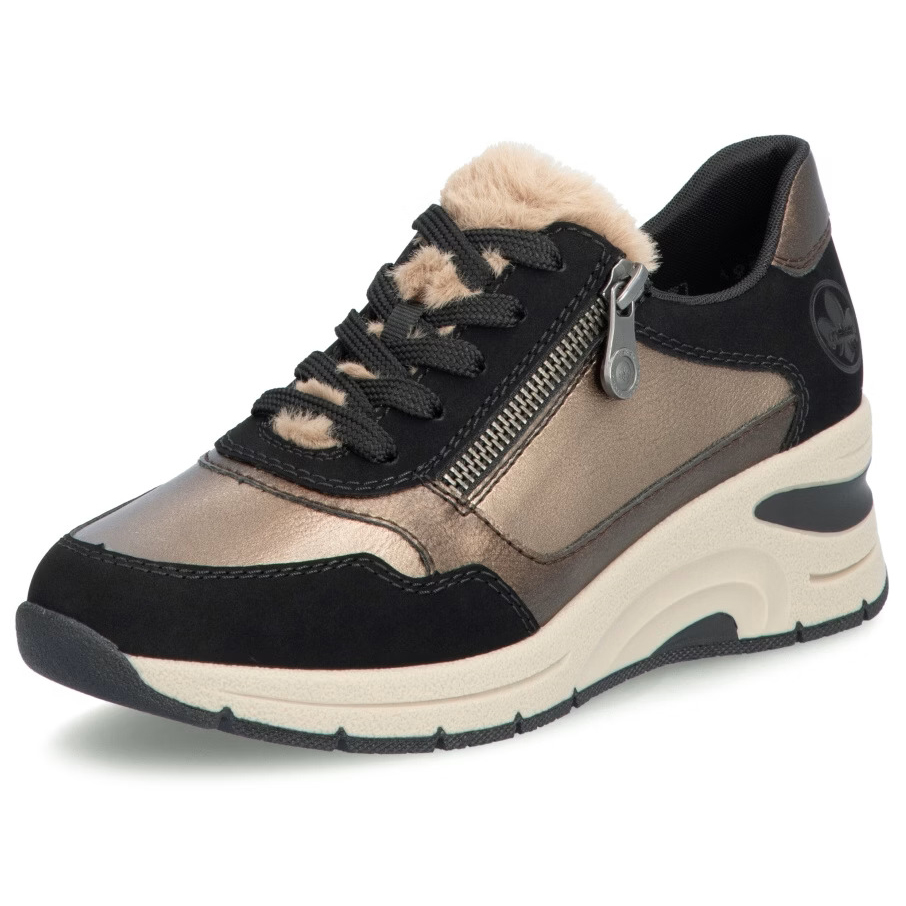 Das Design der Marke RIEKER zeichnet sich durch eine originelle Farb- und Materialkombination aus, die den Schuhen ein einzigartiges Aussehen verleiht. Das Fell am Spann verleiht den Schuhen ein einzigartiges Flair und ist ein interessantes Detail für Ihr Outfit. Die weiche, herausnehmbare Innensohle sorgt für ganztägigen Komfort und Halt, während die stilvolle Sohle nicht nur den modischen Eindruck verstärkt, sondern auch Stöße wirksam absorbiert, was den Gehkomfort verbessert und die Füße schützt. Die Kombination aus Schnürung und Reißverschluss ermöglicht ein einfaches Anziehen und Anpassen an Ihre Bedürfnisse. Aufgrund ihres Komforts und Stils sind diese Schuhe eine gute Wahl für den Alltag.