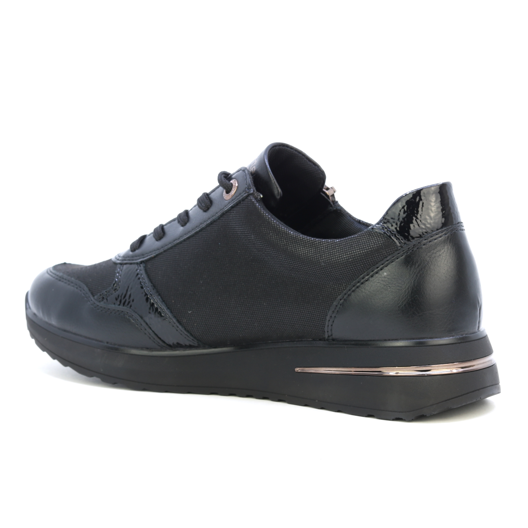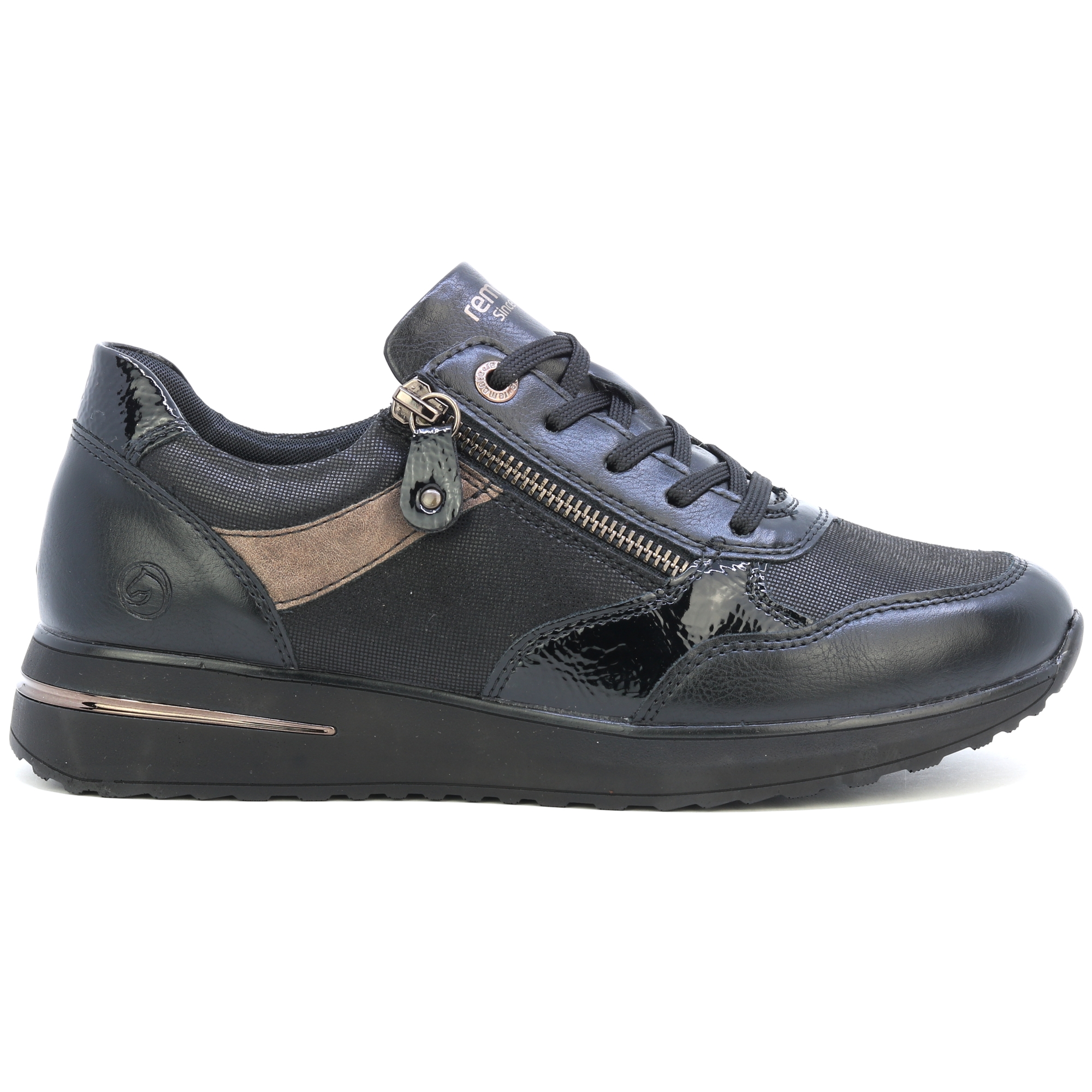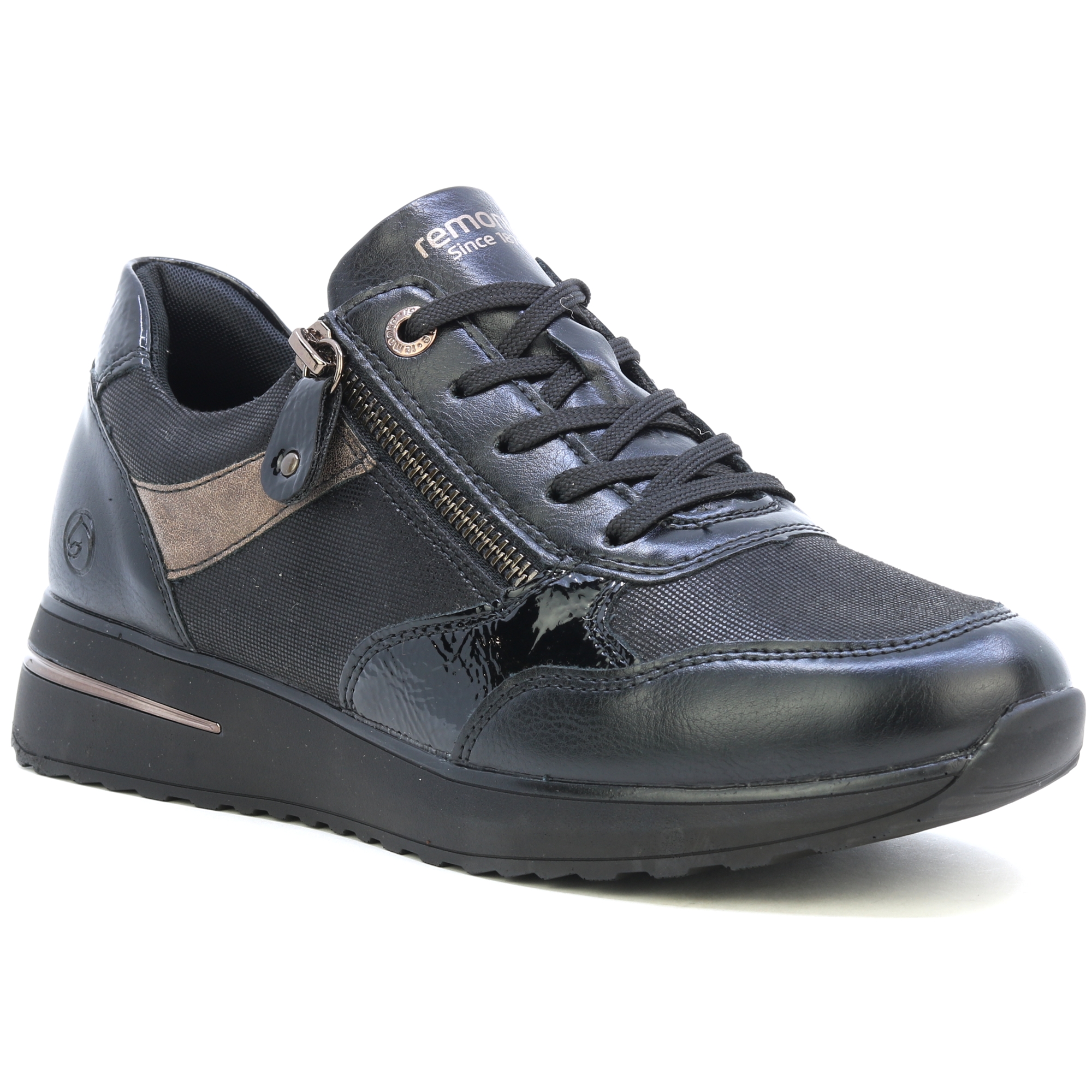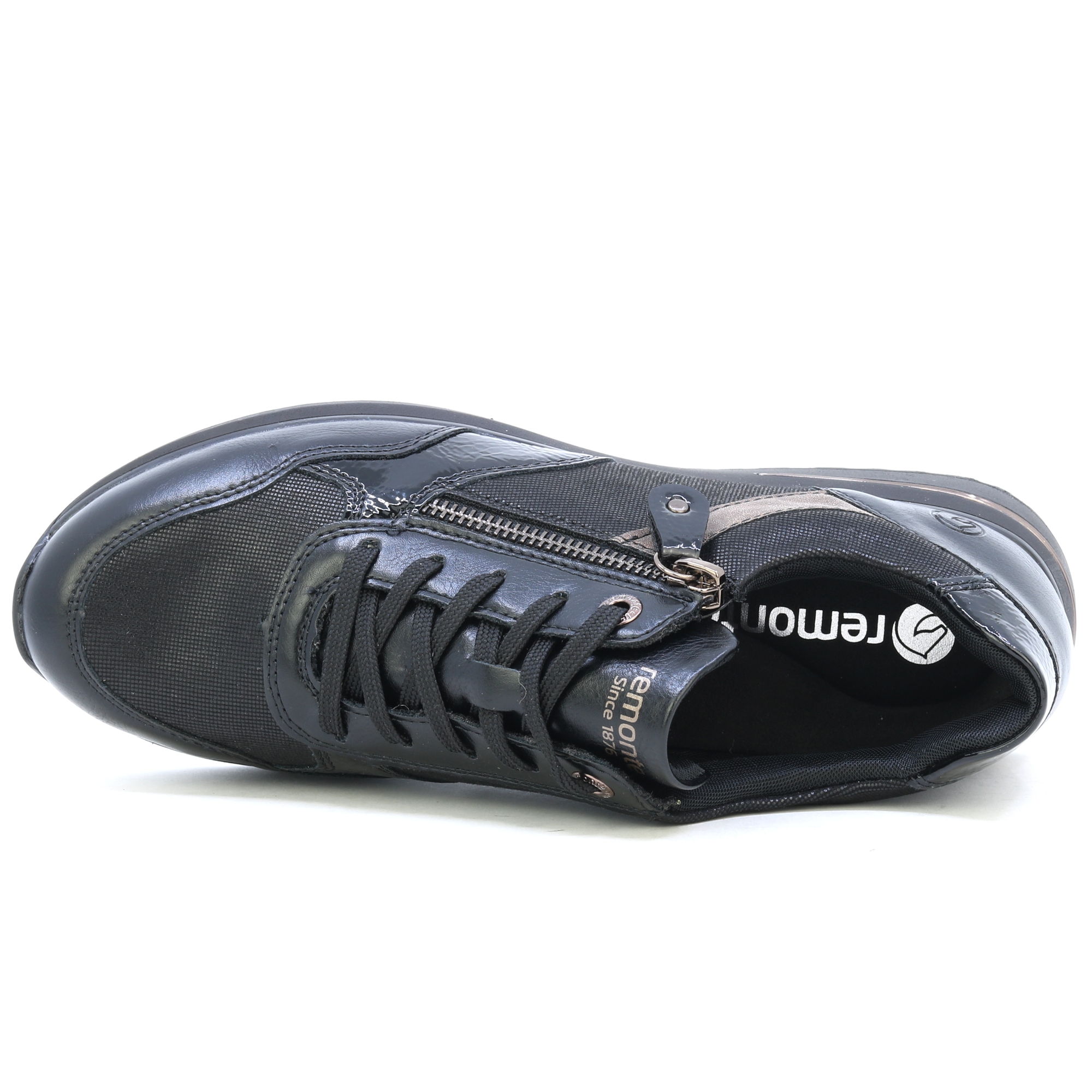 REMONTE-Schuhe sind eine höhere Linie der Marke RIEKER. Die Schuhe zeichnen sich durch die Qualität der verwendeten Materialien aus. Dieser Damen-Sneaker fällt durch sein schwarzes Obermaterial mit kontrastierenden Elementen und dezenten Reflexen lackierter Teile auf den ersten Blick ins Auge. Dank der Schnürung und einem funktionellen Reißverschluss am Spann lassen sich die Schuhe leicht anziehen und an Ihren Fuß anpassen. Für Ihren Komfort bei jedem Schritt sorgt eine weiche Innensohle, die auch herausnehmbar ist. Diese Schuhe passen zu jedem Outfit Ihrer Garderobe, egal ob für die Arbeit oder für einen Spaziergang. Technologie: Remonte Soft – eine einzigartige Einlegesohle aus atmungsaktivem Material, die mit ihrer Form und ihrem Material für ein angenehmes Tragegefühl beim ganztägigen Tragen sorgt.