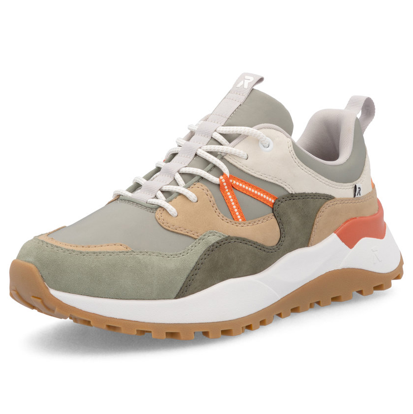 Die modernen Sneakers von Rieker in einer Kombination aus Grün, Beige, Weiß und auffälligem Orange sind perfekt für alle, die auffallen und im Trend bleiben möchten. Das stylische, schichtweise Design in angesagten Farben wirkt frisch und sportlich, während die robuste Sohle mit markantem Profil einen sicheren Schritt gewährleistet. Das Obermaterial besteht aus einer Textil-Synthetik-Mischung, die sowohl Strapazierfähigkeit als auch Komfort bietet. Das Innenmaterial ist ebenfalls Textil, das die Füße angenehm umschließt. Die herausnehmbare Innensohle aus Memory-Schaum ist weich und sorgt für maximalen Komfort während des ganzen Tages. Die synthetische, flexible Sohle mit einer Höhe von 3 cm bietet Stabilität und passt sich jedem Schritt an. Dieses Modell ist in der Weite H erhältlich, was einen geräumigeren Sitz garantiert. Die Marke Rieker ist bekannt für ihre ANTISTRESS-Technologie, die für Leichtigkeit, Flexibilität, bessere Stoßdämpfung und eine einfache Anpassung an jede Fußform sorgt, wodurch den ganzen Tag über optimaler Komfort gewährleistet ist.