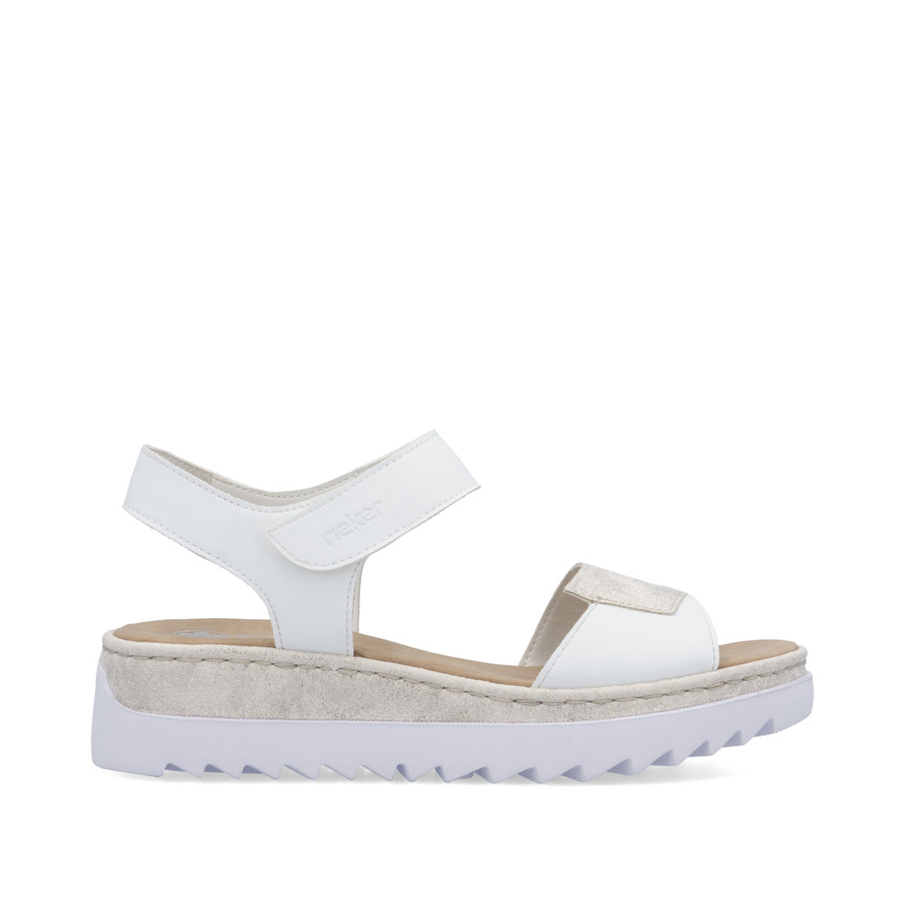 Die zauberhaften RIEKER Sandalen in Weiß begeistern mit einem stilvollen Detail am vorderen Riemen, das dem Schuh ein einzigartiges und modisches Aussehen verleiht. Der Knöchelriemen ist mit einem praktischen Klettverschluss ausgestattet, der ein schnelles An- und Ausziehen sowie eine optimale Anpassung an den Fuß ermöglicht. Die erhöhte Sohle bietet nicht nur einen modernen Look, sondern sorgt auch für hervorragende Stabilität und effektive Stoßdämpfung beim Gehen. Eine weiche Innensohle garantiert ganztägigen Tragekomfort – perfekt für ausgedehnte Spaziergänge oder einen aktiven Tag. Dank der RIEKER Antistress- und RIEKER Light-Technologien sind die Sandalen besonders leicht, flexibel, geräumig und stoßabsorbierend, was den Komfort auf ein neues Level hebt. Diese Sandalen sind die ideale Wahl für stilbewusste Frauen, die auf Komfort nicht verzichten wollen.