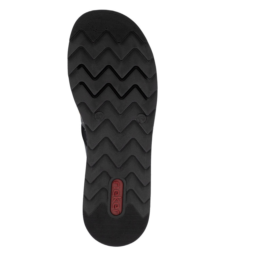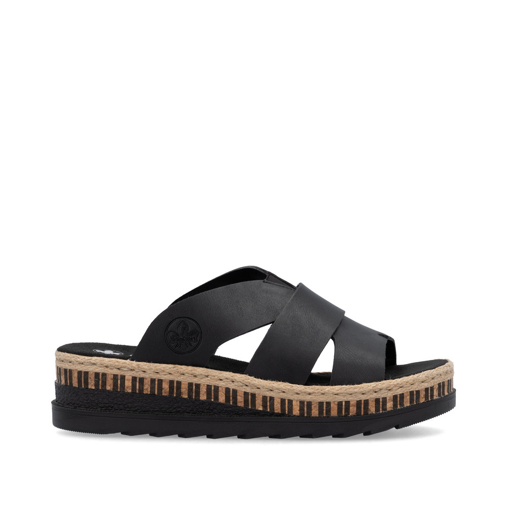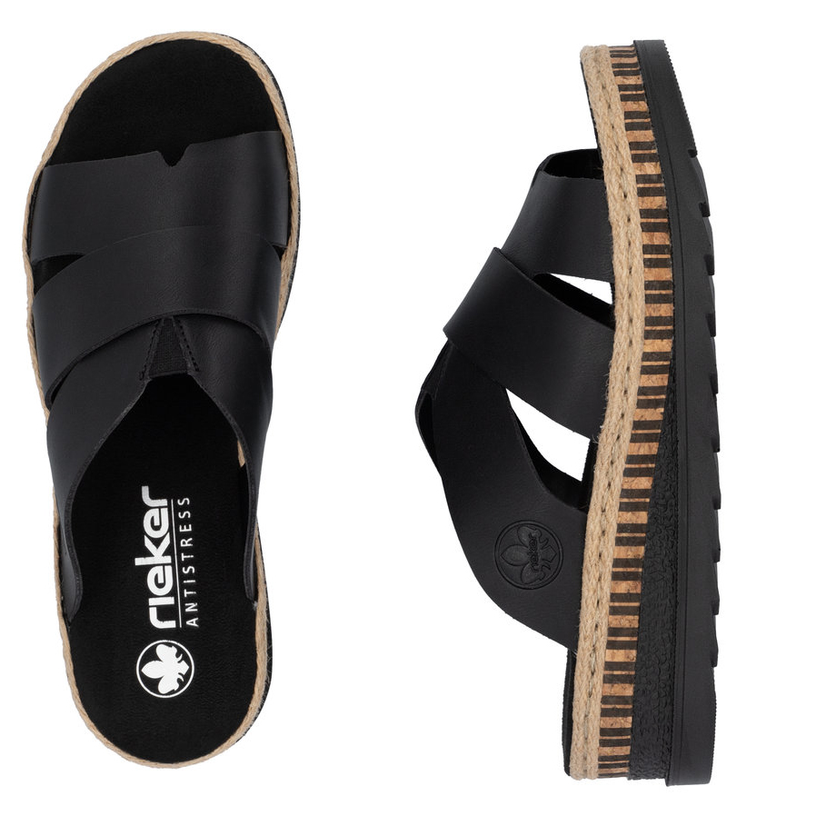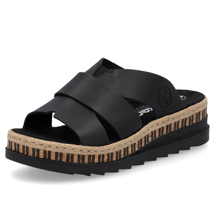 Dieses Modell der Pantoletten von RIEKER ist die perfekte Wahl für Frauen, die stilvolle und bequeme Schuhe für den Alltag suchen. Die breiten, sich überkreuzenden Riemen in klassischem Schwarz verleihen dem Schuh eine zeitlose Eleganz, während das weiche Fußbett aus hochwertigem Material maximalen Komfort beim Gehen bietet. Die leichte und flexible Sohle mit ihrem einzigartigen Design rundet das Gesamtbild perfekt ab. Dank der Antistress-Technologie absorbiert die Sohle Stöße optimal und passt sich der Fußform an, wodurch ein besonders angenehmes Tragegefühl entsteht. Diese Pantoletten lassen sich mühelos zu jedem Outfit kombinieren – sei es für die Arbeit, einen Stadtbummel oder entspannte Freizeitmomente.