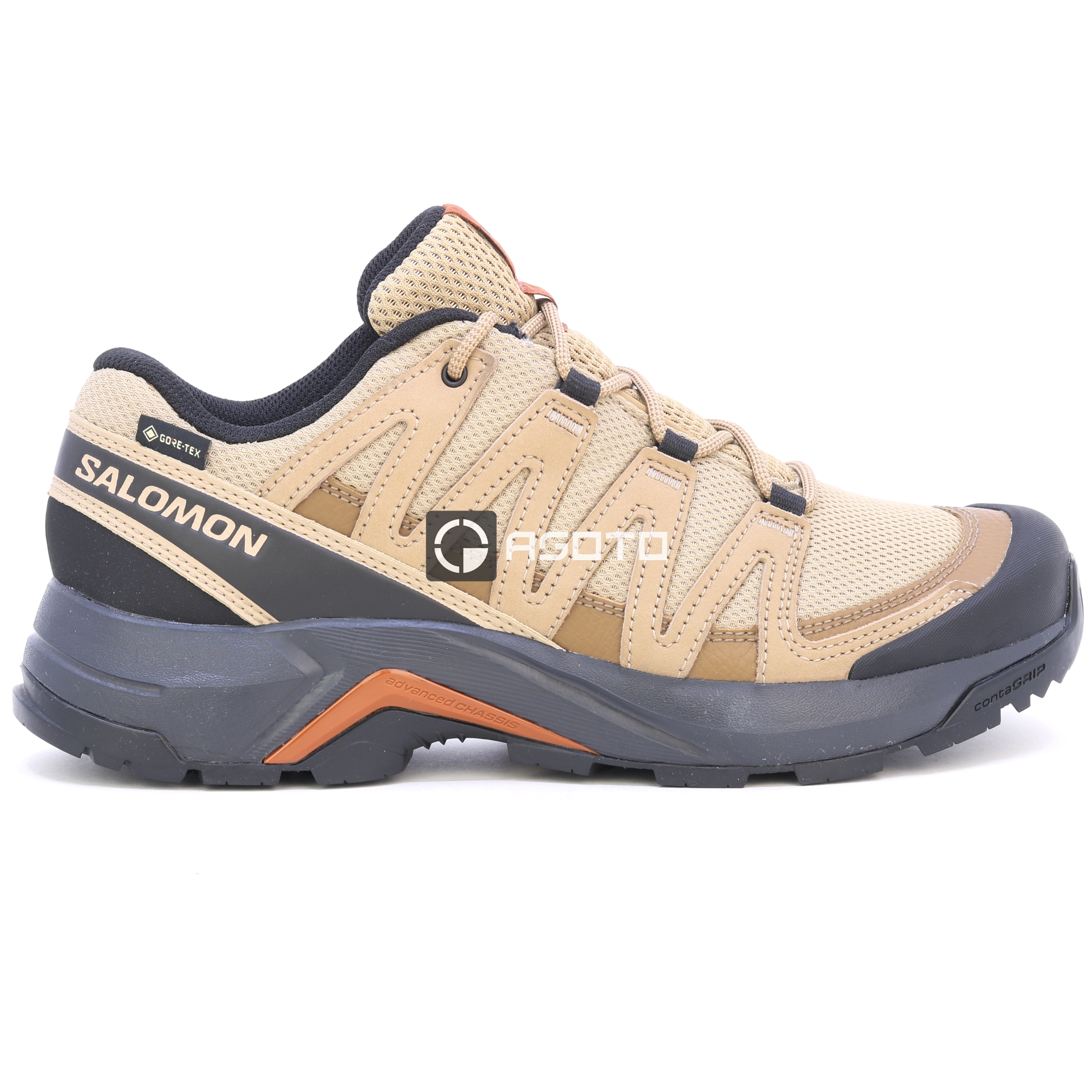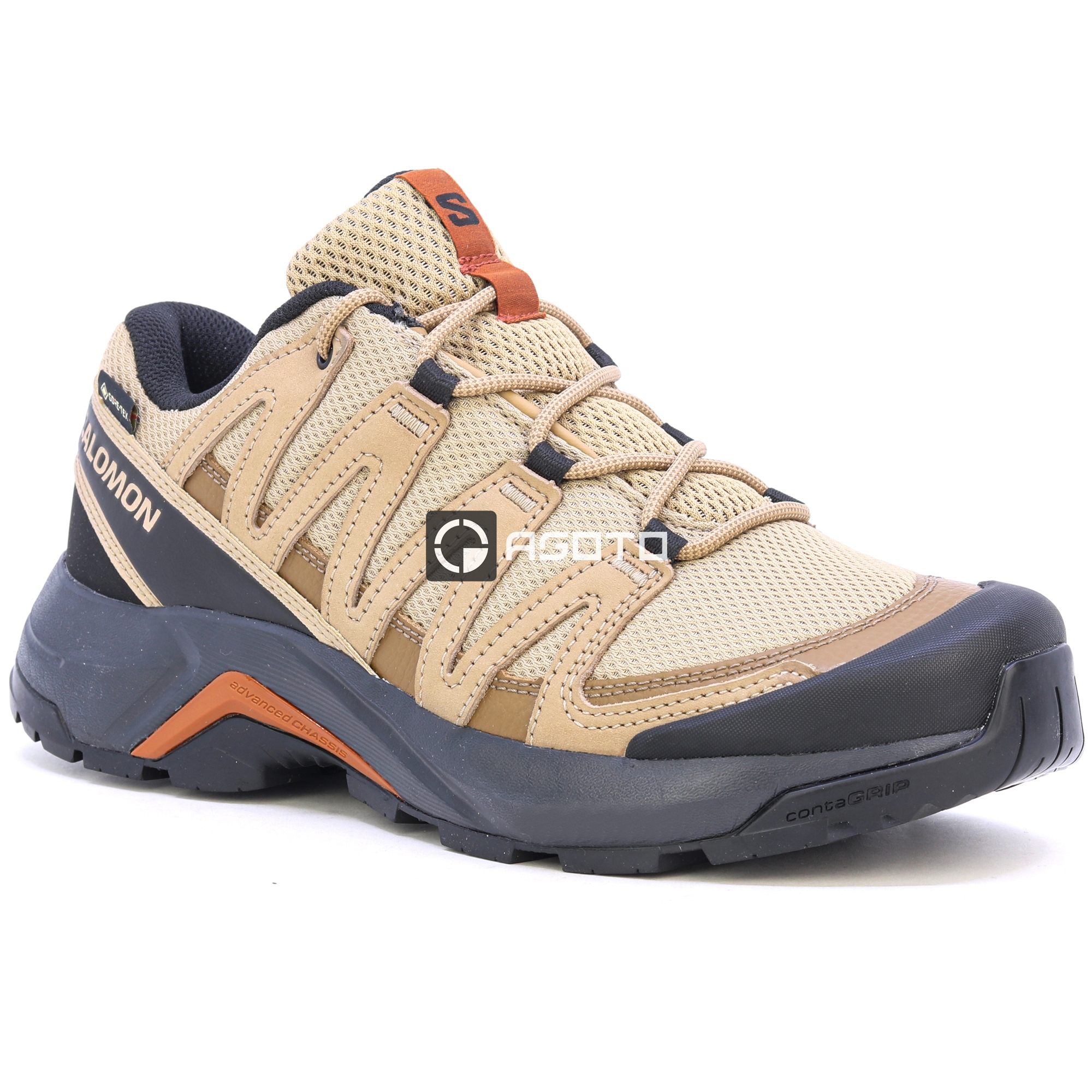 Die SALOMON X-Adventure Recon GTX Herrenschuhe in Beige sind die ideale Wahl für anspruchsvolle Geländetouren und alltägliche Outdoor-Abenteuer. Dank der Gore-Tex® Membran bieten sie zuverlässigen Schutz vor Nässe und gleichzeitig eine hohe Atmungsaktivität, sodass Ihre Füße auch bei schlechtem Wetter trocken bleiben. Die robuste Konstruktion und die verstärkte Zehenkappe schützen den Fuß vor Stößen, während die griffige Sohle Stabilität auf verschiedensten Untergründen gewährleistet – von felsigen Pfaden bis hin zu schlammigen Wegen. Der ergonomische Schnitt und die bequeme Dämpfung sorgen für maximalen Komfort, selbst bei langen Wanderungen.
