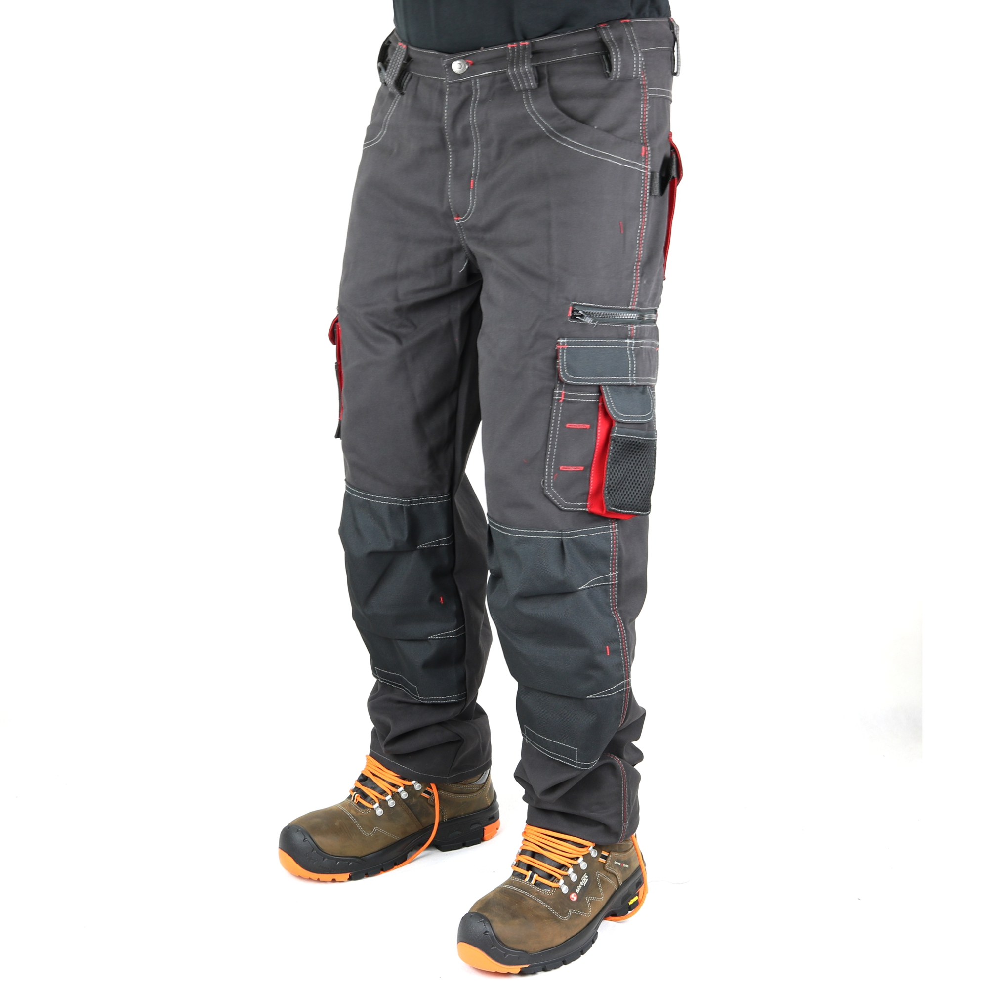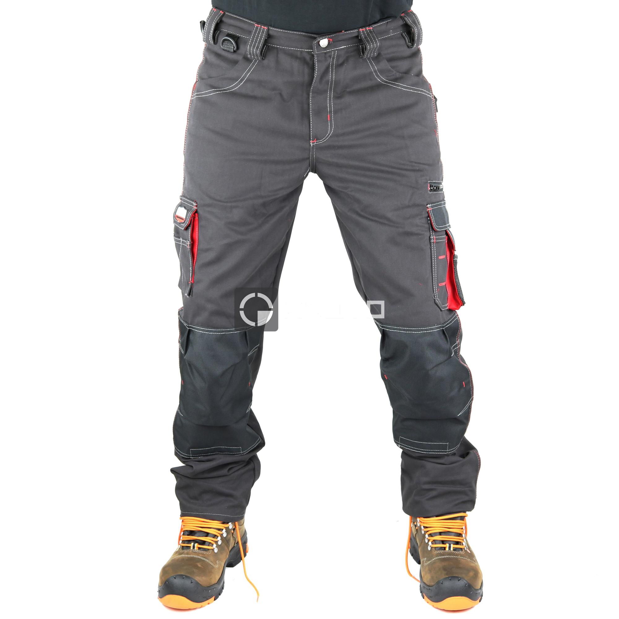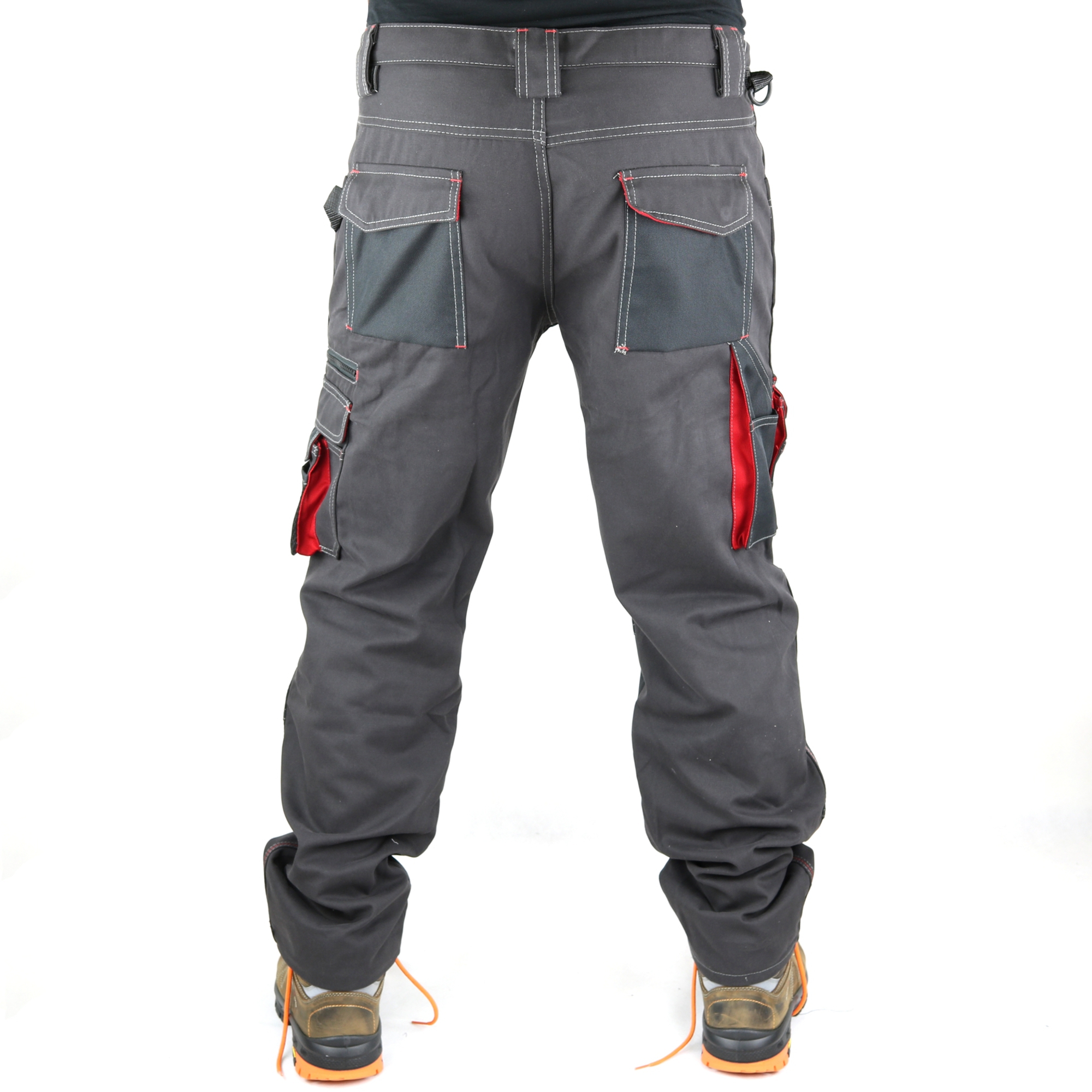 Mehr Taschenhose aus 65% Polyester und 35% Twill-Baumwolle, Gewicht 300 g/m2. Sie hat zwei Fronttaschen, zwei Gesäßtaschen aus abriebfestem Gewebe mit Patte und Knopf. Auf der rechten Seite: Doppeltasche für Messgerät, D-Ring, multifunktionale Utility-Tasche mit Patte und Klettverschluss und Stifthalter. Links: ein Stoffring für Werkzeughalter über den Taschen, einer mit Reißverschluss und einer mit Patte und Klettverschluss. Verschleißschutzverstärkung an den Kniepolstertaschen; gepaarte Nähte, Doppelnähte, rote Details und schwarze Cordura-Einsätze.