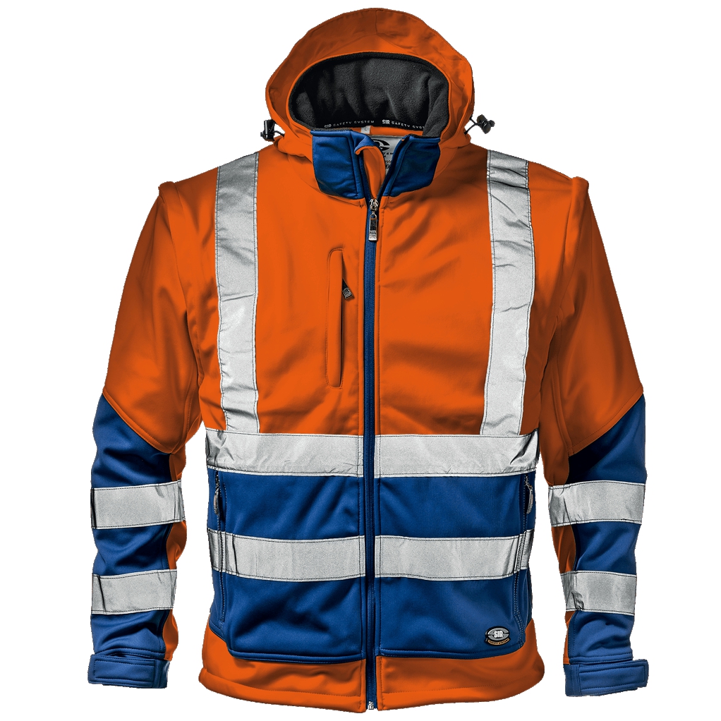 Vysoce viditelná bunda Softshell, vnitřní vrstva z mikrovlákna fleece. Centrální zapínání na zip, spodní část bundy nastavitelná se stahovací šňůrkou a odnímatelnou kapucí se zipem a stahovací šňůrkou; odnímatelné rukávy se zipem, manžety nastavitelné suchým zipem, dvě kapsy na rukávech se zipem a kapsy na hrudi se zipem. EN ISO 20471