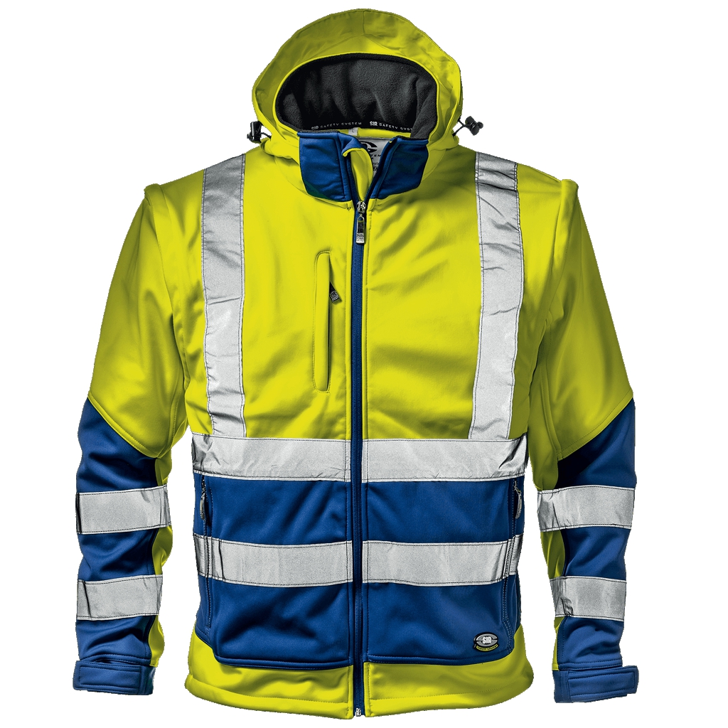Vysoce viditelná bunda Softshell, vnitřní vrstva z mikrovlákna fleece. Centrální zapínání na zip, spodní část bundy nastavitelná se stahovací šňůrkou a odnímatelnou kapucí se zipem a stahovací šňůrkou; odnímatelné rukávy se zipem, manžety nastavitelné suchým zipem, dvě kapsy na rukávech se zipem a kapsy na hrudi se zipem. EN ISO 20471