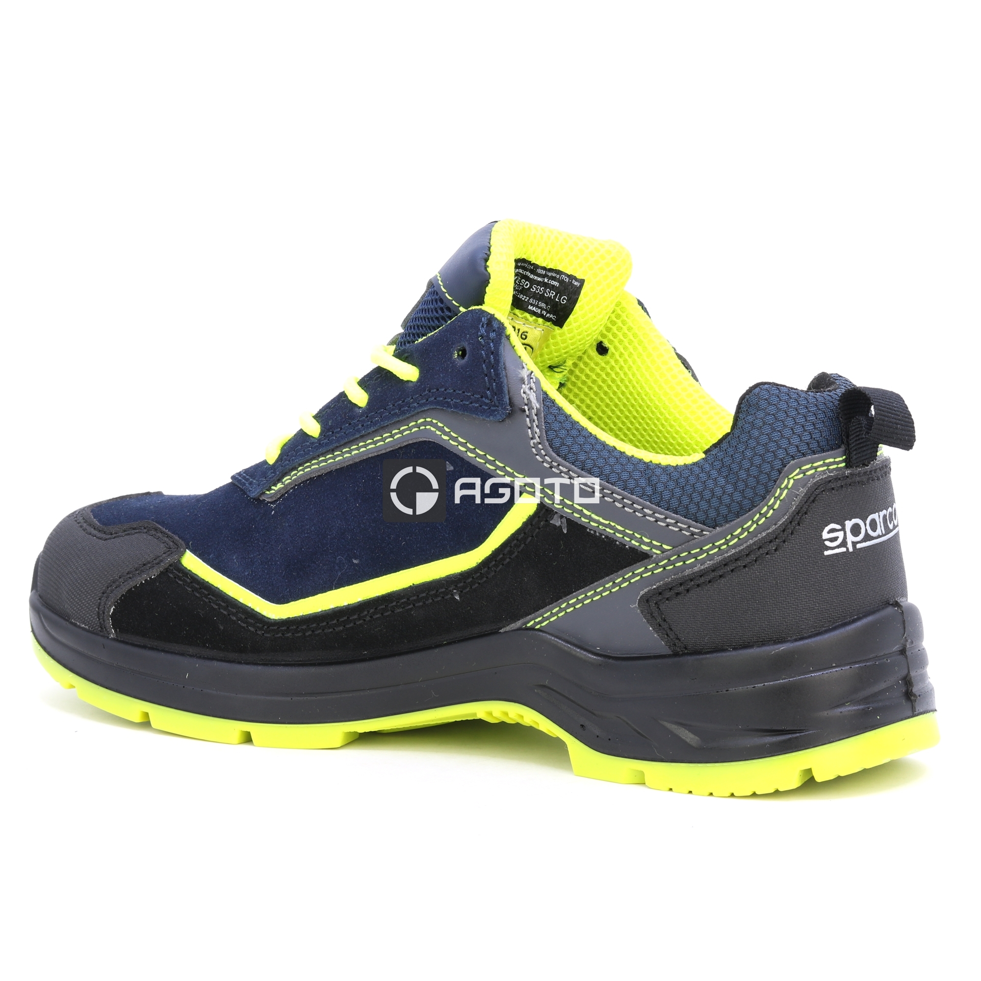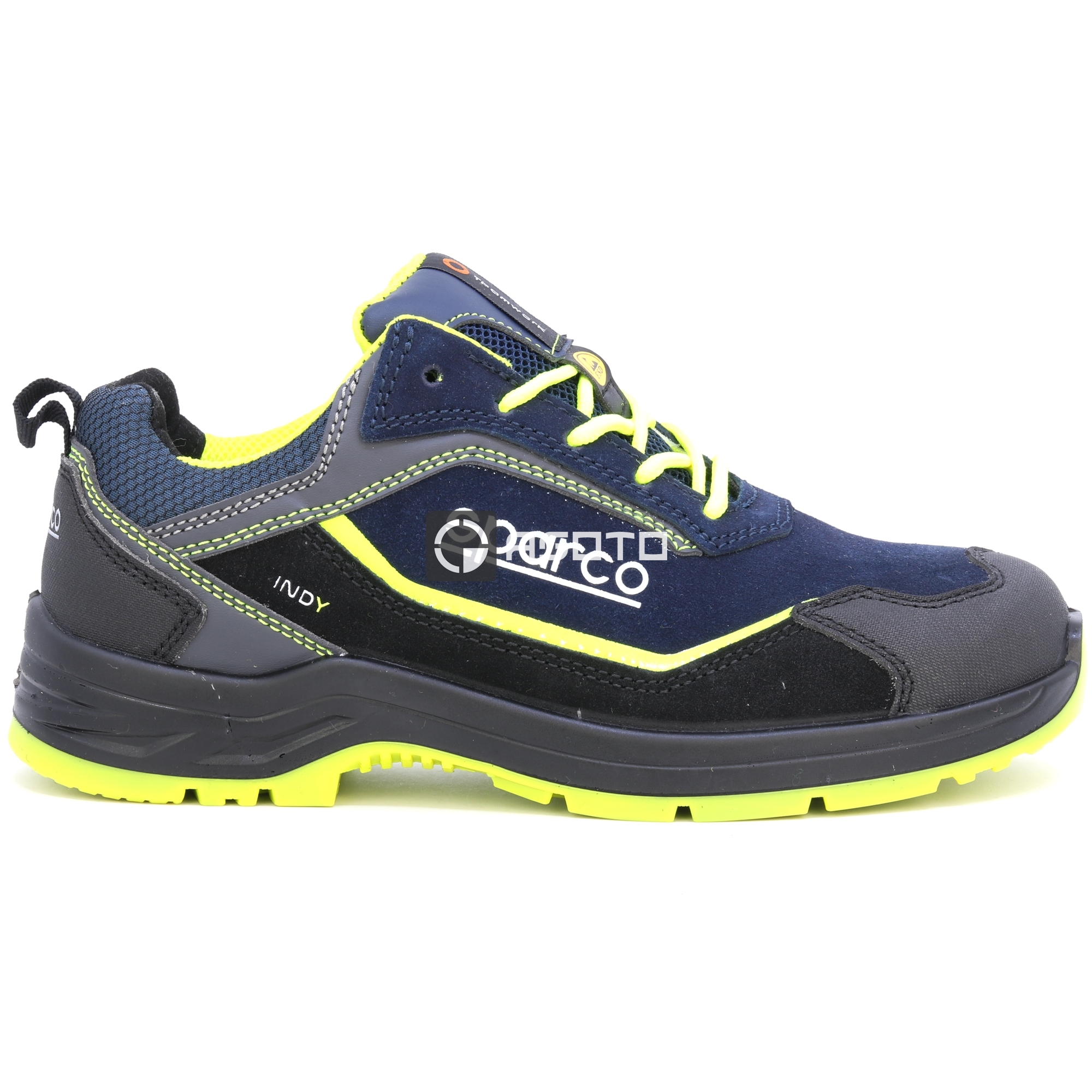 Vom Rennsport abgeleitete Schuhe. Sicherheitsschuh nach der neuen Norm ISO 20345:2022, aus feinem, wasserabweisendem Veloursleder, „flexgrip+“-Zweischicht-PU-Sohle mit speziellem Absatz, der die Anforderungen für Leitergriffigkeit (lg) erfüllt. leicht und für alle Anwendungen geeignet.