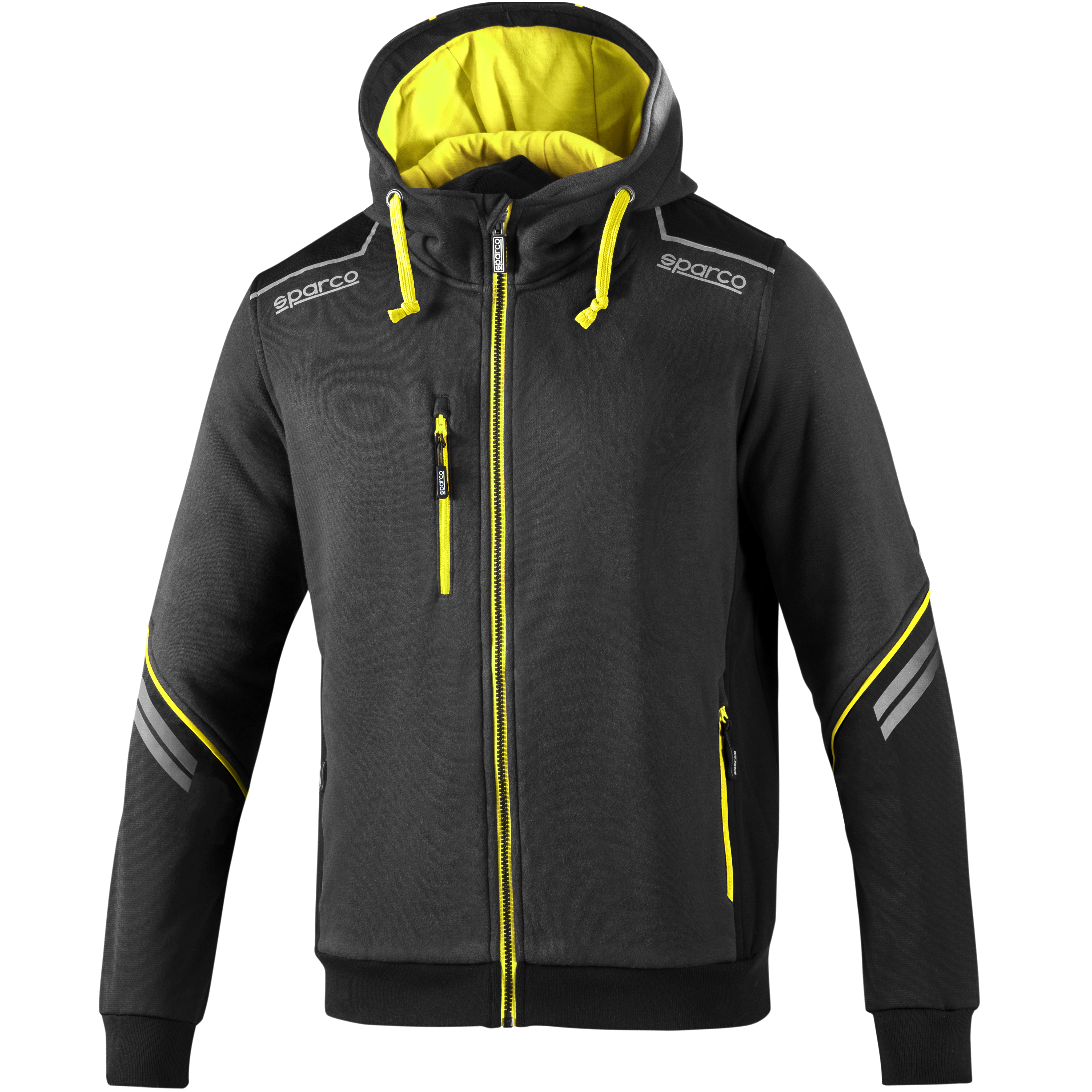 80 % Baumwolle – 20 % Polyester / 280 g/m2 Sparco-Reflexlogos, verstärkte Ärmel mit Anti-Scheuer-Einsätzen und gut sichtbaren Reflexstreifen. Verstärkungen an den Schultern, seitlicher Reißverschluss an der Brusttasche, integrierte, verstellbare Kapuze mit kontrastfarbener Innenseite.