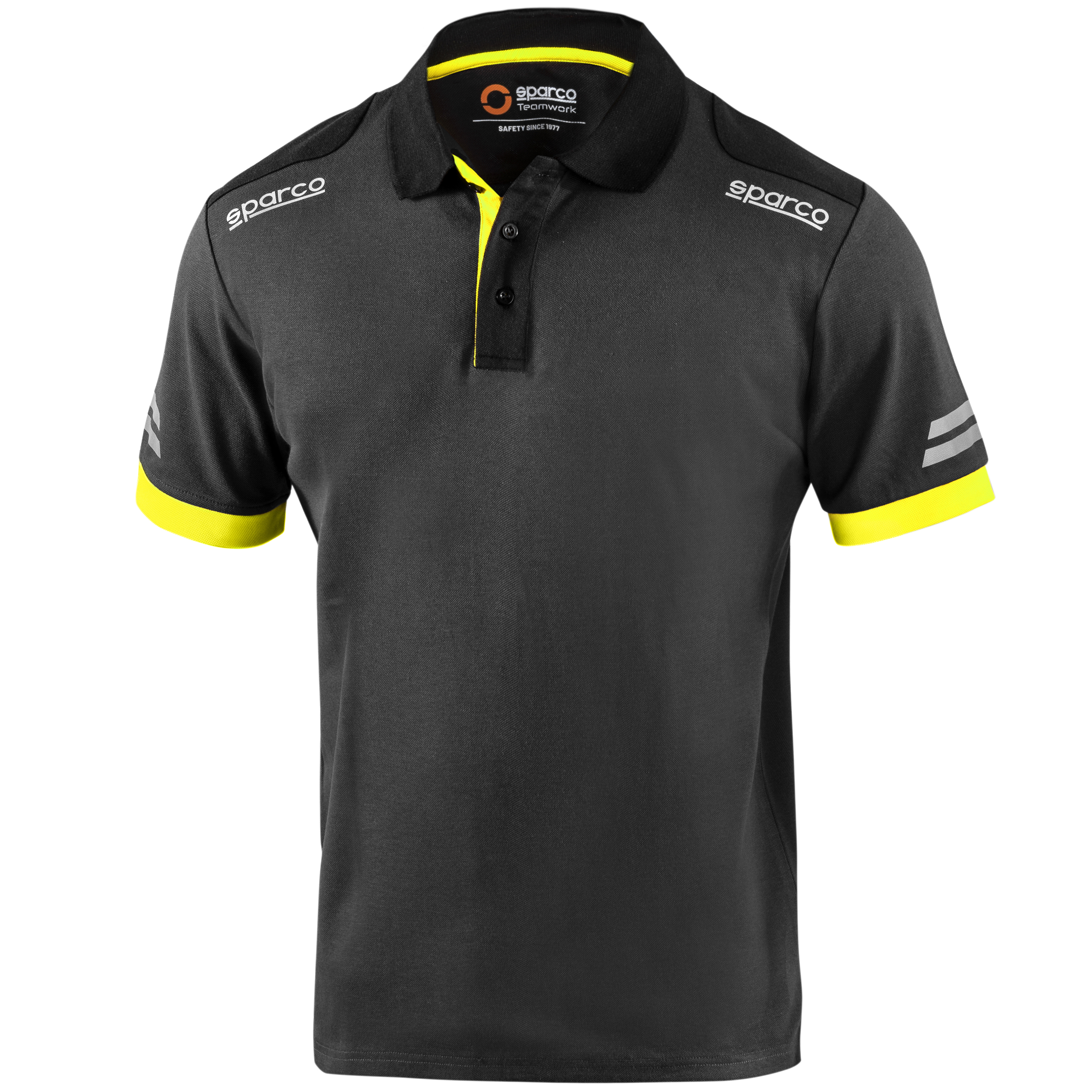 65 % Baumwolle – 35 % Polyester mit Pique-Effekt / 180 g/m2, reflektierende Sparco-Logos, gut sichtbare Streifen auf reflektierenden Ärmeln, kontrastierende Ärmel- und Krageneinsätze, verstärkte Schultern und 3-Knopf-Halsverschluss, Seitenschlitze an der Unterseite.